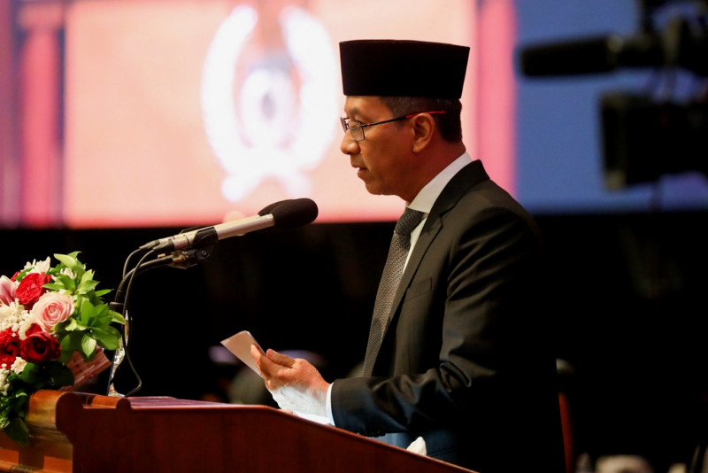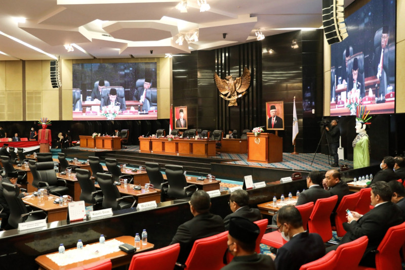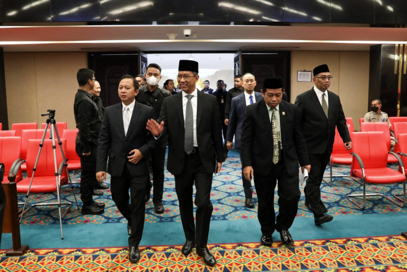 Penjabat (Pj) Gubernur DKI Jakarta, Heru Budi Hartono menyampaikan pidato penjelasan terhadap dua Raperda dalam Rapat Paripurna DPRD DKI Jakarta di Ruang Rapat Paripurna DPRD, Jakarta Pusat, Senin (13/3). Kedua Raperda yang telah diusulkan oleh eksekutif untuk dibahas dan disahkan oleh DPRD DKI Jakarta yakni terkait pengelolaan air limbah domestik dan rencana umum energi daerah (RUED). (Foto: Nugroho Sejati/beritajakarta.id)