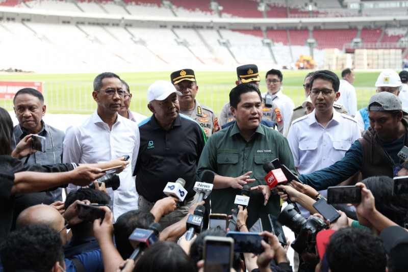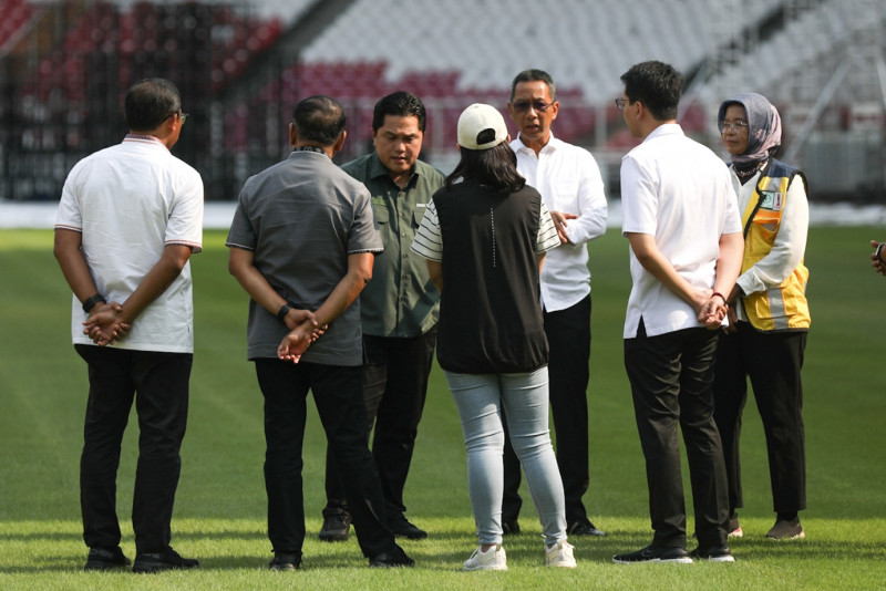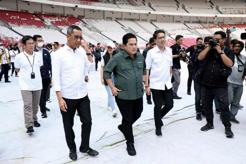 Penjabat (Pj) Gubernur DKI Jakarta, Heru Budi Hartono bersama Menteri BUMN sekaligus Ketua Umum PSSI, Erick Thohir, meninjau lapangan Stadion Utama Gelora Bung Karno (SUGBK) di Jakarta Pusat, Senin (13/3). Sebagai salah satu tuan rumah, Pemerintah Provinsi DKI Jakarta memastikan siap mendukung pelaksanaan Piala Dunia U-20 yang akan berlangsung pada 20 Mei hingga 11 Juni 2023. (Foto: Nugroho Sejati/beritajakarta.id)