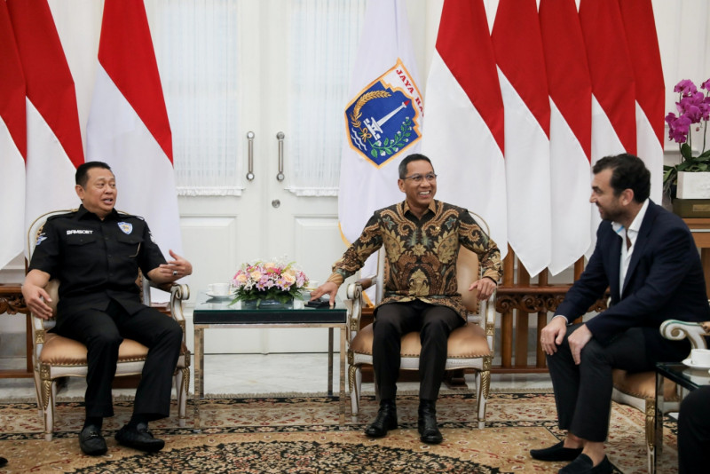 Penjabat (Pj) Gubernur DKI Jakarta, Heru Budi Hartono menerima kunjungan Ketua Ikatan Motor Indonesia (IMI), Bambang Soesatyo, beserta Ketua Panitia Pelaksana Formula E Jakarta, Ananda Mikola, dan Co-Founder Formula E Operation (FEO), Alberto Longo, di Ruang Tamu Balai Kota DKI Jakarta, Gambir, Jakarta Pusat, Selasa (14/3). Pertemuan tersebut membahas penyelenggaraan Formula E 2023 yang akan berlangsung pada 3-4 Juni 2023 di Jakarta International E-Prix Circuit (JIEC), Jakarta Utara. (Foto: Nugroho Sejati/beritajakarta.id)