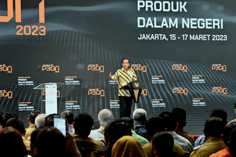 Pemerintah Provinsi DKI Jakarta menerima penghargaan Peningkatan Penggunaan Produk Dalam Negeri (P3DN) kategori Pengguna Produk Dalam Negeri Terbaik Pemerintah Daerah Provinsi di Istora Senayan, Tanah Abang, Jakarta Pusat, Rabu (15/3). Presiden Republik Indonesia, Joko Widodo memberikan langsung penghargaan yang diinisiasi oleh Kementerian Perindustrian RI tersebut kepada Penjabat (Pj) Gubernur DKI Jakarta, Heru Budi Hartono. (Foto: Nugroho Sejati/beritajakarta.id)