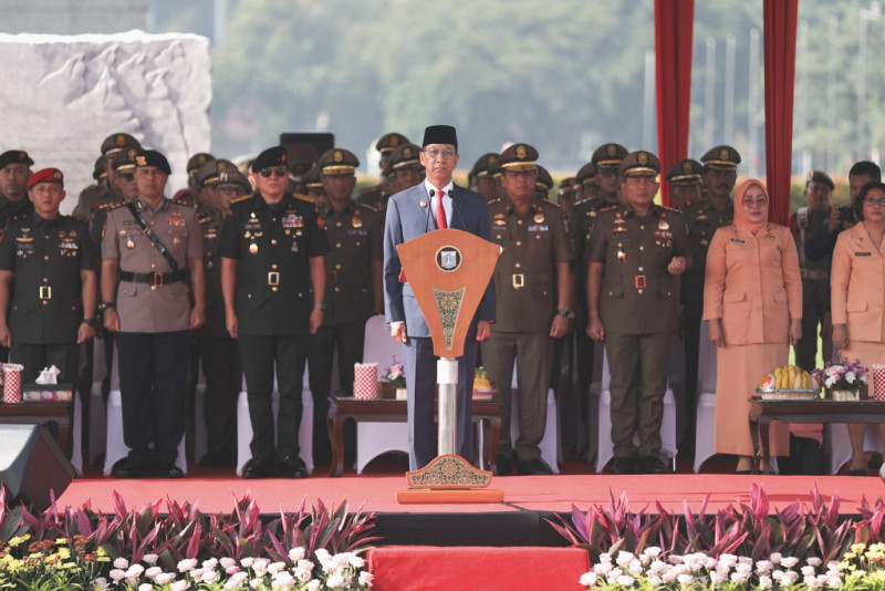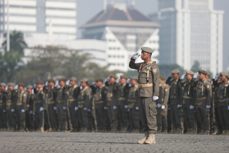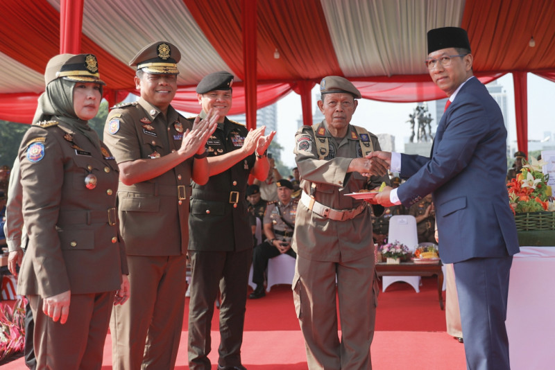 Penjabat (Pj) Gubernur DKI Jakarta, Heru Budi Hartono menjadi Inspektur dalam Upacara Hari Ulang Tahun Satuan Polisi Pamong Praja (Satpol PP) dan Satuan Perlindungan Masyarakat (Satlinmas) di Silang Monas Selatan, Gambir, Jakarta Pusat, Kamis (16/3). Pada peringatan hari ulang tahun ke-73 dan ulang tahun ke-61, Satpol PP dan Satlinmas diharapkan dapat mewujudkan Jakarta sebagai wilayah tertib dan ramah investasi melalui Satpol PP dan Satlinmas yang profesional dan humanis. (Foto: Nugroho Sejati/beritajakarta.id)