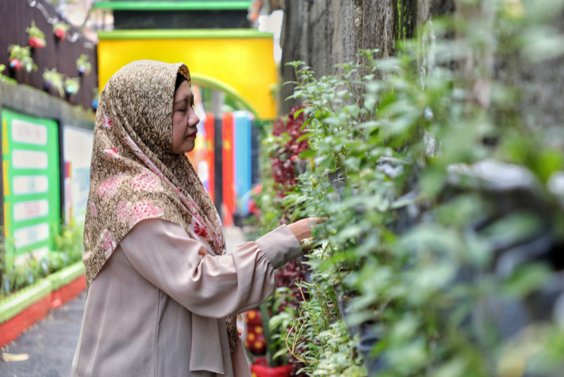 Melihat kawasan unggulan di Gang H Soleh Pedo di RT 02/01, Kelurahan Tanjung Duren Selatan (TDS), Kecamatan Grogol Petamburan, Jakarta Barat, Kamis (16/3). Penataan dengan pembuatan mural-mural bertema Jakarta dan pembuatan taman vertikal yang ditanami tanaman hias, toga, dan pohon produktif seperti cabai, tomat, terung dan lain-lain.(Foto: Andri Widiyanto/beritajakarta.id)