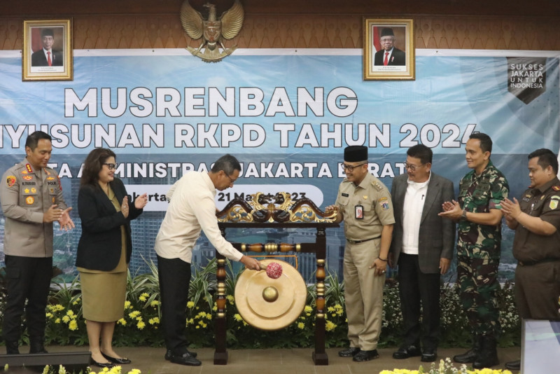 Penjabat (Pj) Gubernur DKI Jakarta, Heru Budi Hartono membuka Musyawarah Perencanaan Pembangunan Rencana Kerja Pemerintah Daerah (Musrenbang RKPD) Tingkat Kota Jakarta Barat di ruang Pola Kantor Wali Kota Jakarta Barat, Selasa (21/3). Sebanyak 1.487 usulan diakomodir Pemerintah Kota (Pemkot) Jakarta Barat dalam Musyawarah Perencanaan Pembangunan (Musrenbang) Rencana Kerja Pemerintah Daerah (RKPD) tahun 2024. (Foto: Mochamad Tresna Suheryanto/beritajakarta.id)