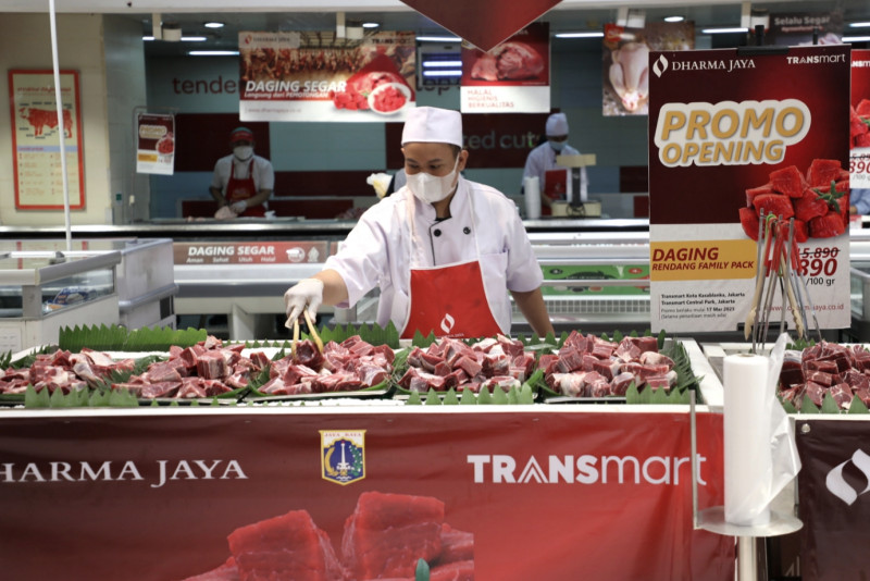 Penjabat (Pj) Gubernur, Heru Budi Hartono meninjau stok daging dari Perumda Dharma Jaya di gerai Transmart, Mall Kota Kasablanka, Jakarta Selatan, pada Selasa (21/3). Dalam tinjauannya Pj Gubernur mengatakan, kerja sama dengan pasar swalayan, seperti Transmart ini, telah membantu DKI Jakarta dalam rangka mewujudkan ketersediaan daging dan harga yang stabil, serta bisa menjangkau seluruh kebutuhan warga. (Foto: Mochamad Tresna Suheryanto/beritajakarta.id)