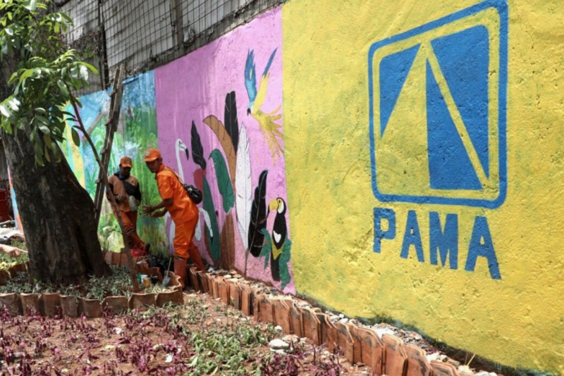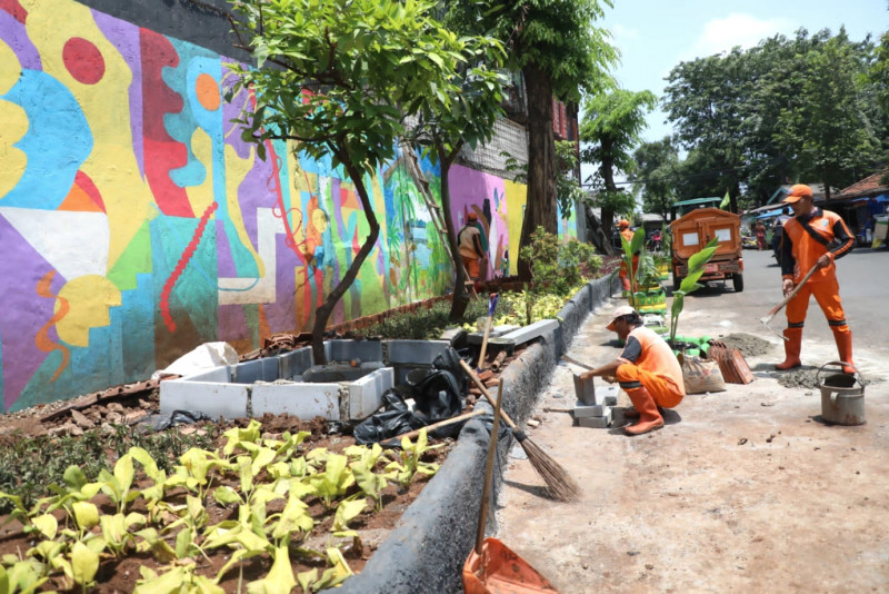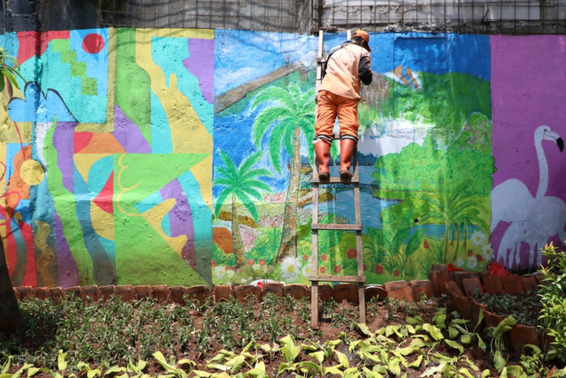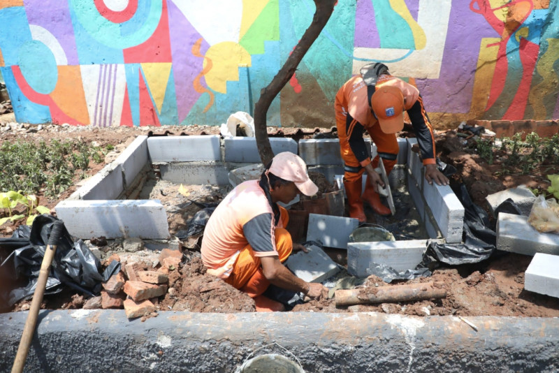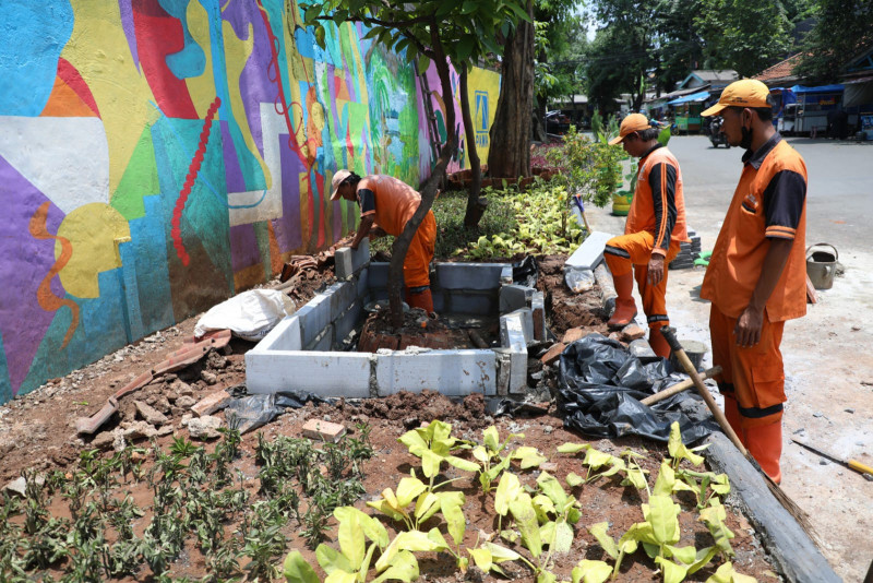 Petugas Penanganan Prasarana dan Sarana Umum (PPSU) Kelurahan Jatinegara merubah lahan yang awalnya menjadi tempat pembuangan sampah dan parkir liar ini ditata menjadi Taman Waduk Rawa Badung yang hijau dan asri di Jalan Alkautsar, Jatinegara, Cakung, Jakarta Timur. Penataan lahan di wilayah perbatasan antara RT 09/13 dan RT 10/08 dengan penghijauan, mural serta areal lahan taman bakal dilengkapi kolam ikan, tempat duduk dan spot swafoto. (Foto: Mochamad Tresna Suheryanto/beritajakarta.id)
