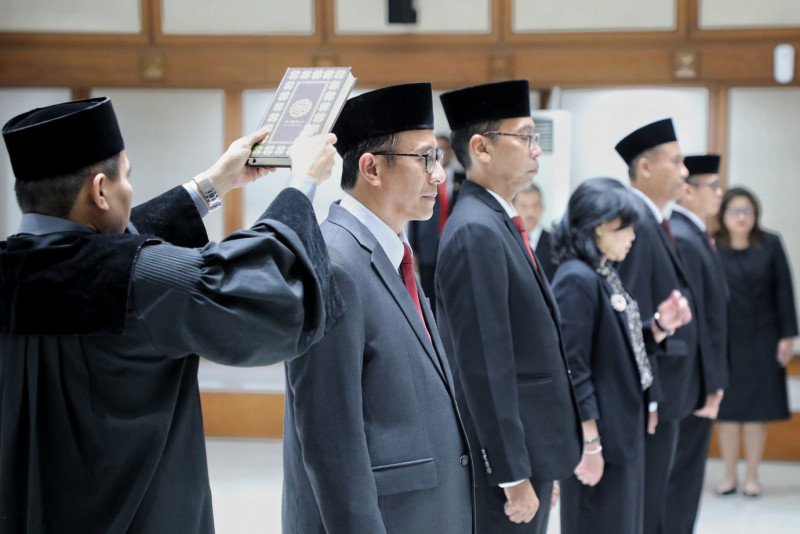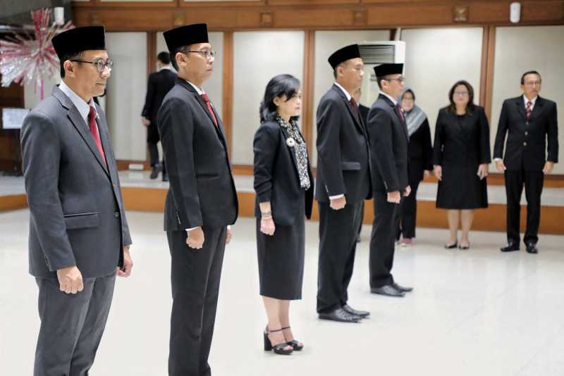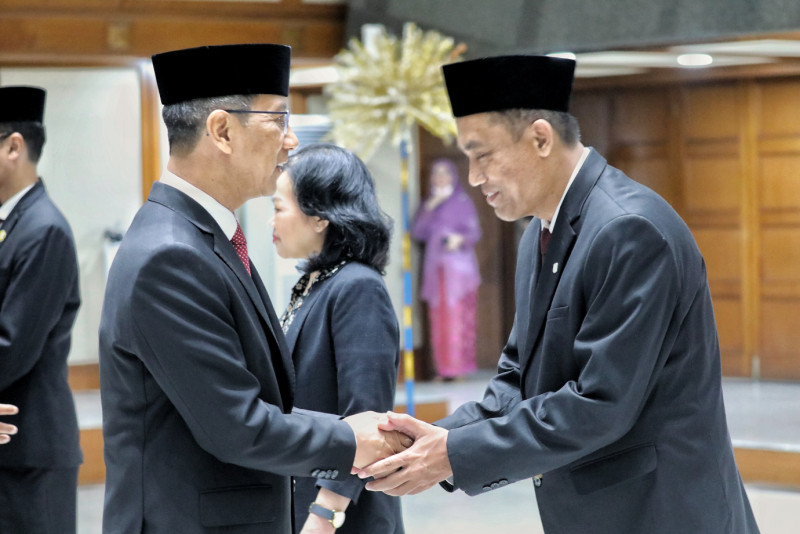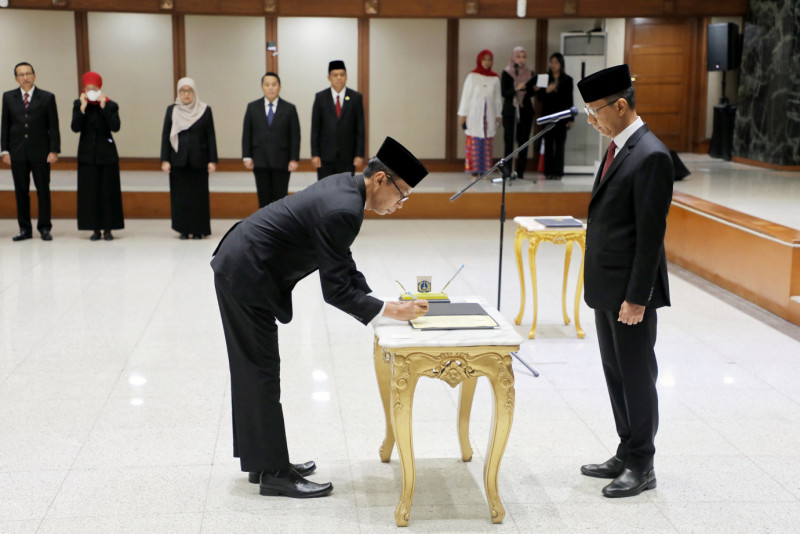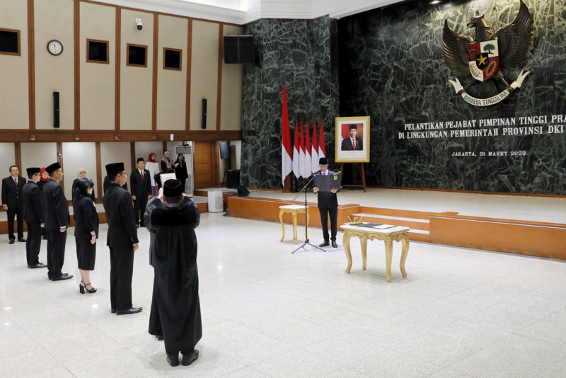 Penjabat (Pj) Gubernur DKI Jakarta, Heru Budi Hartono melantik dan mengukuhkan lima pejabat pimpinan tinggi pratama pemerintah Provinsi DKI Jakarta di Balai Agung, Gedung Balai Kota DKI Jakarta, Gambir, Jakarta Pusat, Jumat (31/3). Kelima pejabat yang dilantik yakni, Kepala Badan Pembinaan Badan Usaha Milik Daerah (BP BUMD) Provinsi DKI Jakarta, Nasruddin Djoko Surjono, Asisten Pembangunan dan Lingkungan Hidup Sekda Provinsi DKI Jakarta, Afan Adriansyah Idris, Kepala Badan Pendapatan Daerah Provinsi DKI Jakarta, Lusiana Herawati, Inspektur Provinsi DKI Jakarta, Syaefuloh Hidayat dan Kepala Badan Pengembangan Sumber Daya Manusia Provinsi DKI Jakarta, Mochamad Miftahulloh Tamary.