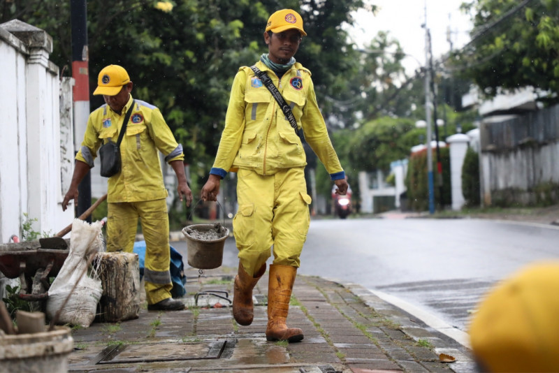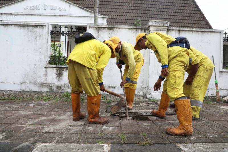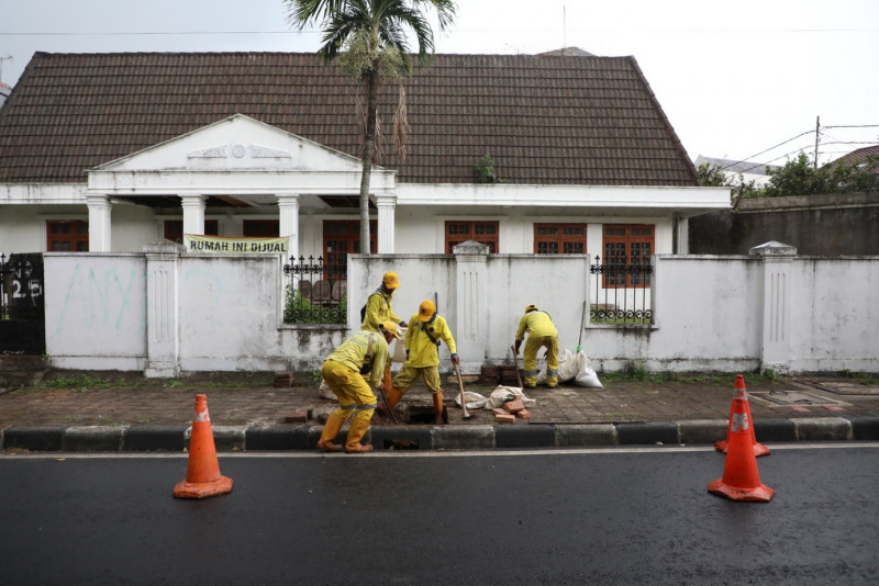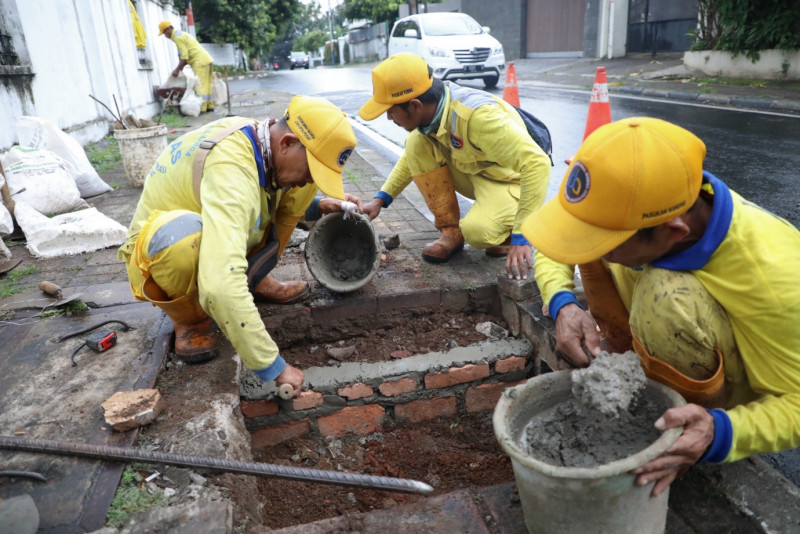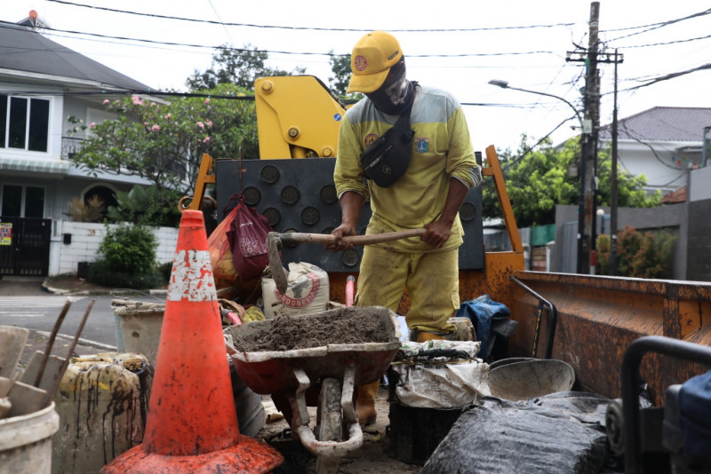 Enam petugas Satuan Pelaksana (Satpel) Bina Marga Kecamatan Menteng melakukan perbaikan tali air di Jalan Syamsu Rizal, Menteng, Jakarta Pusat, Senin (3/4). Perbaikan ini dilakukan karena tali air sudah rusak karena endapan lumpur sehingga saluran tidak bekerja secara normal.