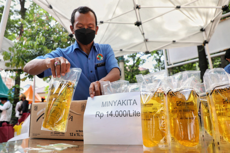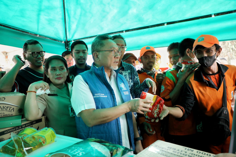 Kepala Dinas Perdagangan, Perindustrian, Koperasi Usaha Kecil dan Menengah (PPKUKM) DKI Jakarta, Elisabeth Ratu Rante Allo dampingi Menteri Perdagangan (Mendag) RI, Zulkifli Hasan meninjau pasar murah di halaman Kantor Kecamatan Kebayoran Baru, Jakarta Selatan, Selasa (4/4). Peninjauan ini dilakukan untuk memastikan ketersediaan bahan pokok yang murah dan berkualitas selama bulan #Ramadan.