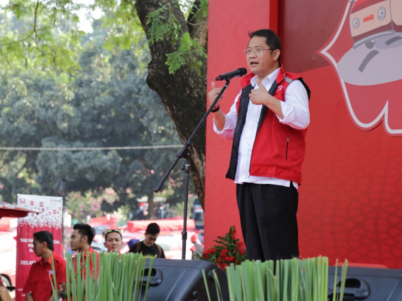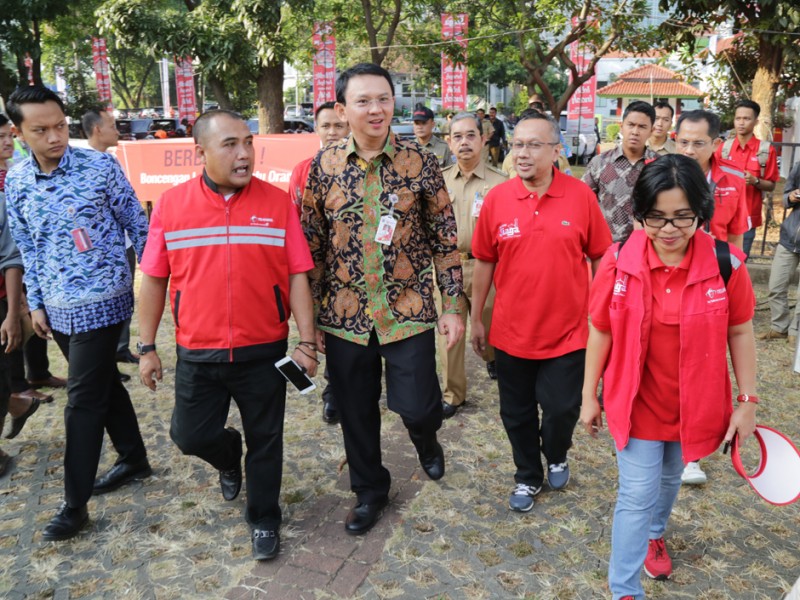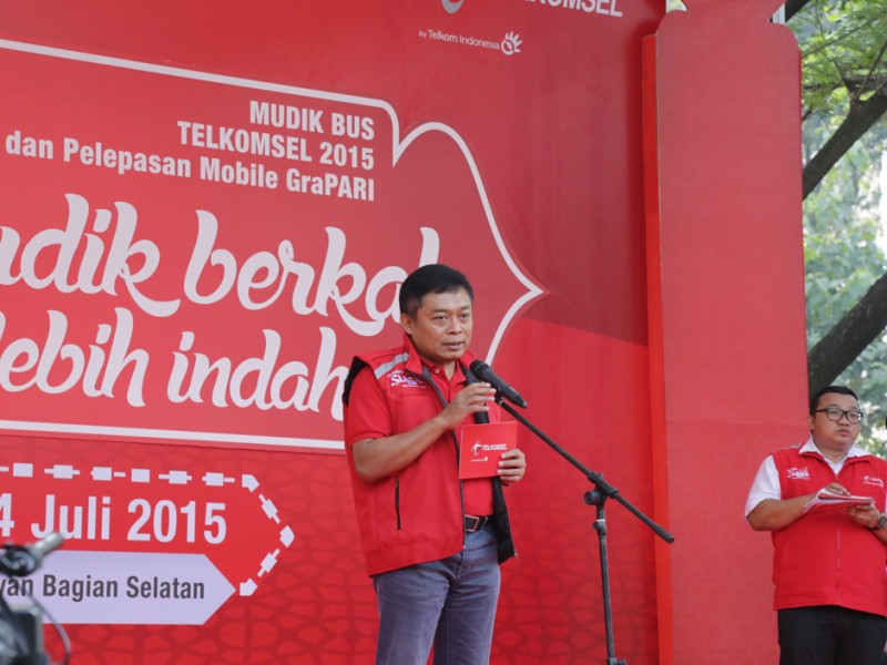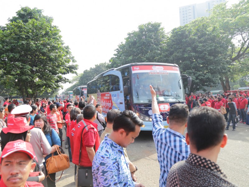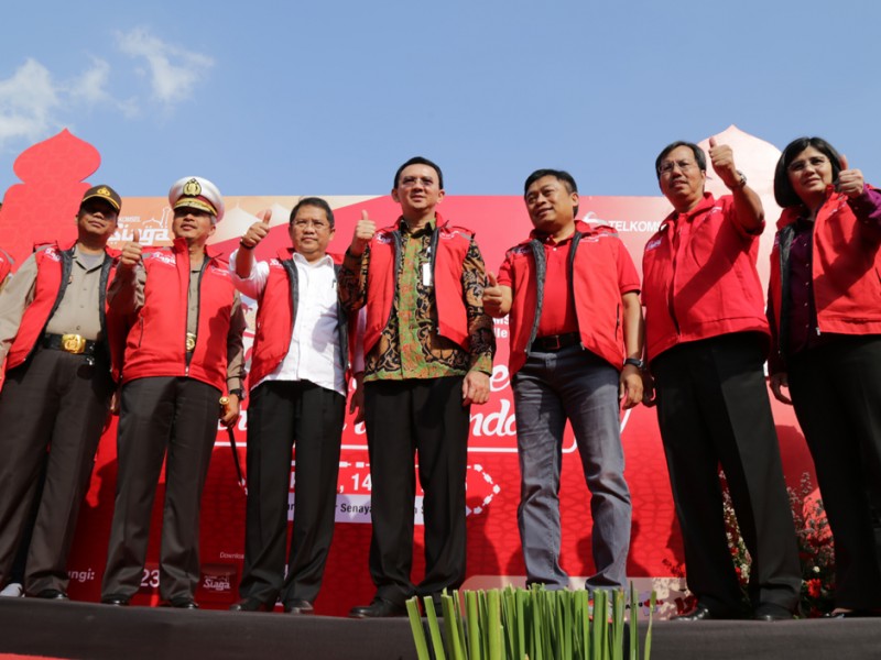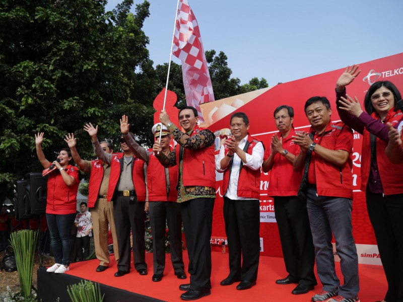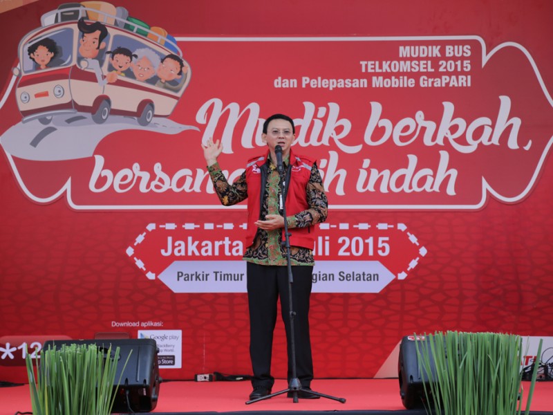 Gubernur DKI Jakarta, Basuki Tjahaja Purnama melepas keberangkatan peserta mudik gratis di Parkir Timur Senayan, Jakarta Pusat, Selasa (14/07/2015). Peserta mudik gratis ini difasilitasi salah satu operator telepon selular dengan tujuan sejumlah kota di Jawa Barat, Jawa T engah dan Jawa Timur. (Foto: Yopie/beritajakarta.com)