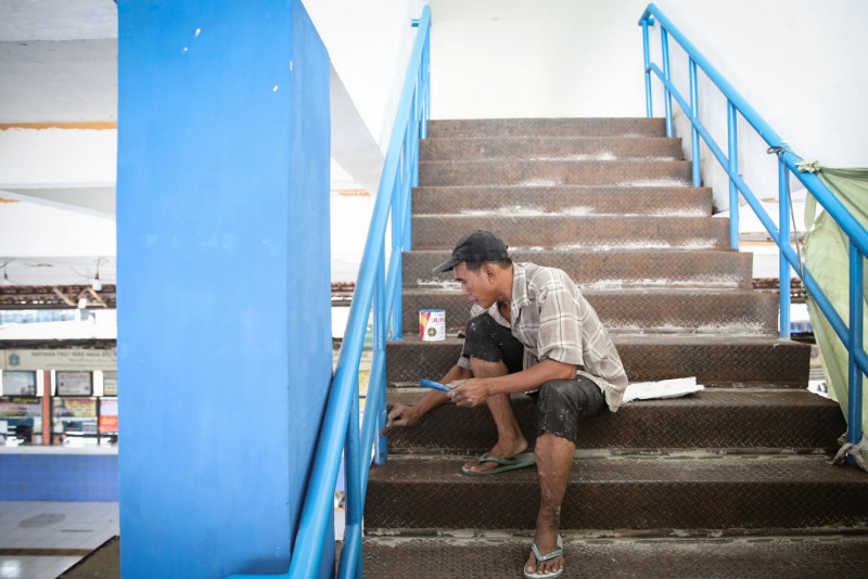 Sejumlah pekerja memperbaiki sejumlah fasilitas dan bangunan Terminal Kampung Rambutan, Kecamatan Ciracas, Jakarta Timur, Senin (10/4). Perbaikan yang di antaranya meliputi pengecatan dinding, penambahan lampu dan perbaikan tangga untuk memberikan kenyamanan penumpang yang akan mudik ke kampung halaman.