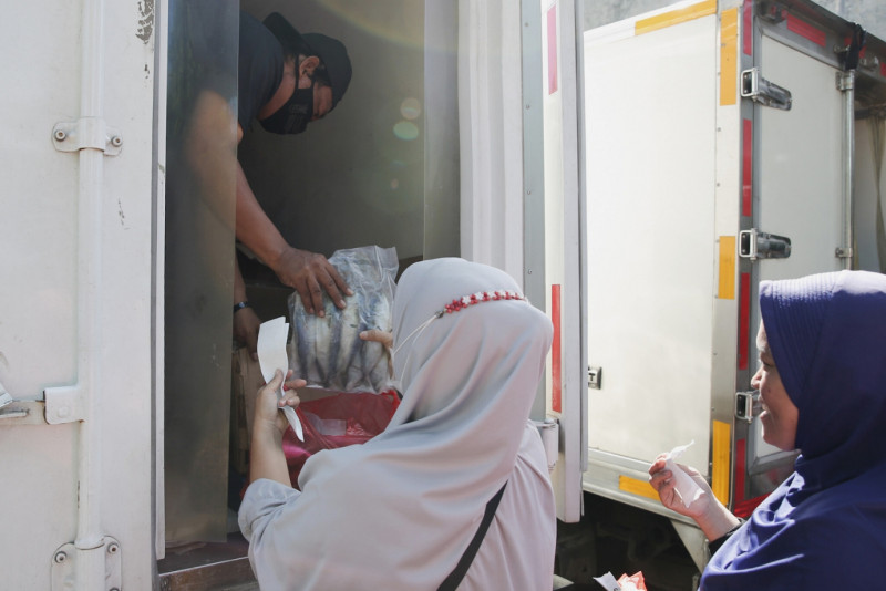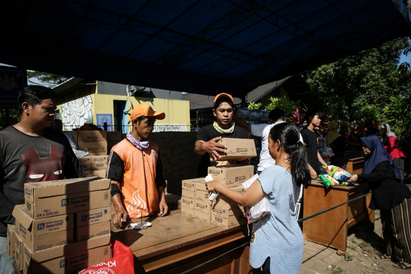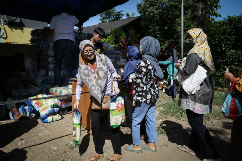 Petugas mendistribusikan pangan murah bersubsidi kepada warga penerima manfaat di Ruang Publik Terpadu Ramah Anak (RPTRA) Payung Tunas Teratai, Cipayung, Jakarta Timur, Selasa (11/4). Pemprov DKI Jakarta melalui Dinas Ketahanan Pangan, Kelautan, dan Pertanian (KPKP) melakukan program penjualan pangan murah bersubsidi yang terdiri dari beras, susu, daging, ikan kembung, dan telur bagi warga penerima manfaat.