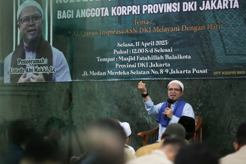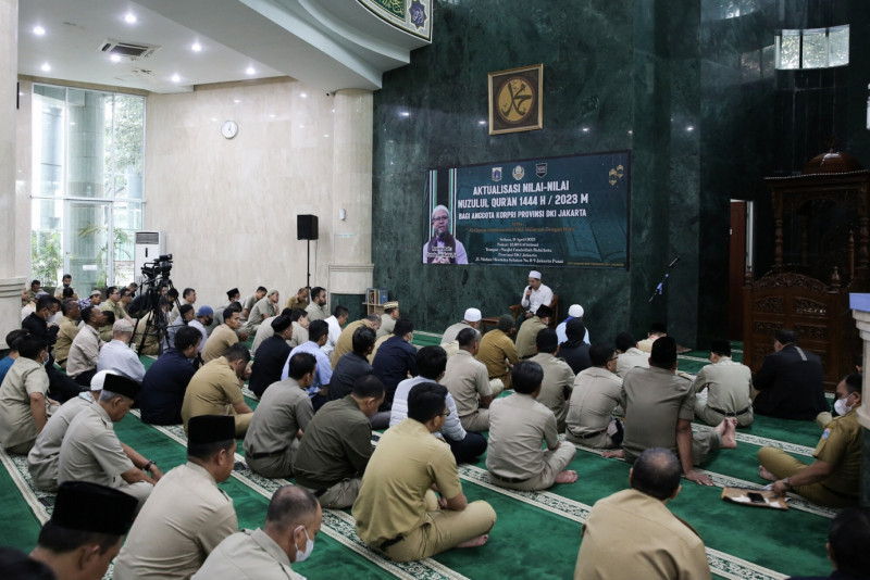Korps Pegawai Republik Indonesia (KORPRI) DKI Jakarta pada #Ramadan tahun ini menggelar kajian aktualisasi nilai-nilai Nuzulul Quran 1444 H dengan tema Al-Quran Inspirasi ASN DKI Melayani dengan Hati di Masjid Fatahillah Balai Kota DKI Jakarta, Selasa (11/4). Kajian dibuka Kepala Biro Pendidikan dan Mental Spiritual (Dikmental) Setda Provinsi DKI Jakarta, Gunas Mahdianto dan menjadi penceramah, Ustaz Abi Makki.