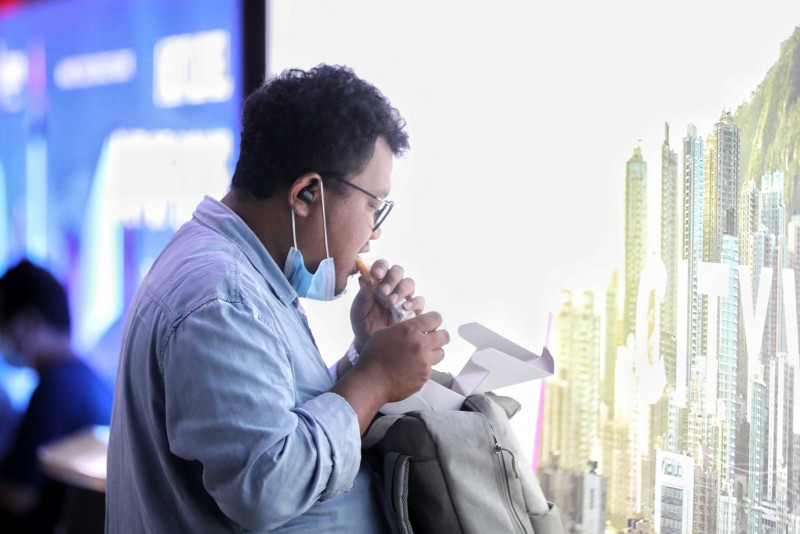 Suasana saat jam berbuka puasa di Stasiun Sudirman, Jakarta Pusat. PT KAI Commuter menerapkan aturan khusus kepada penumpang (Kereta Rel Listrik) KRL atau commuter line selama bulan #Ramadan, yakni penumpang dibolehkan makan dan minum dalam gerbong KRL saat waktu berbuka puasa.