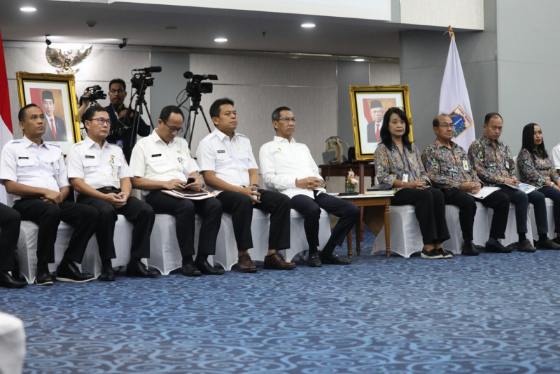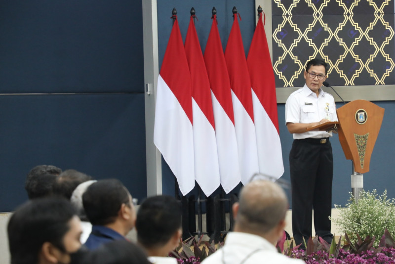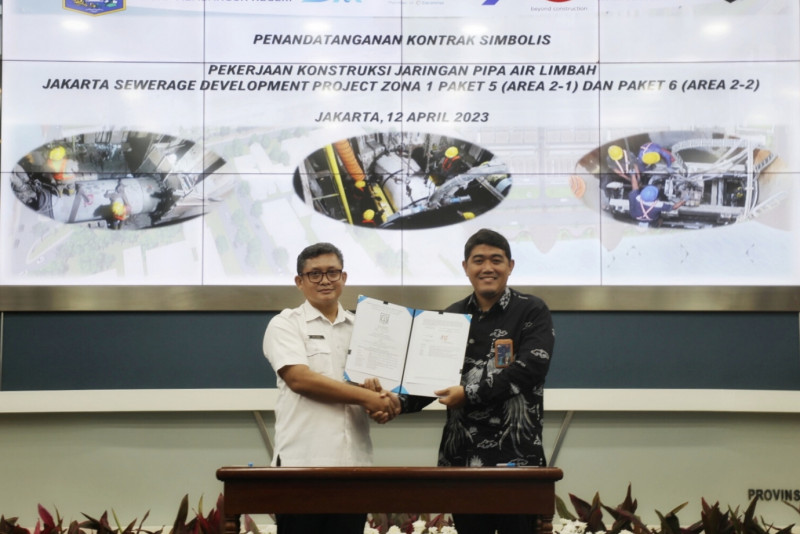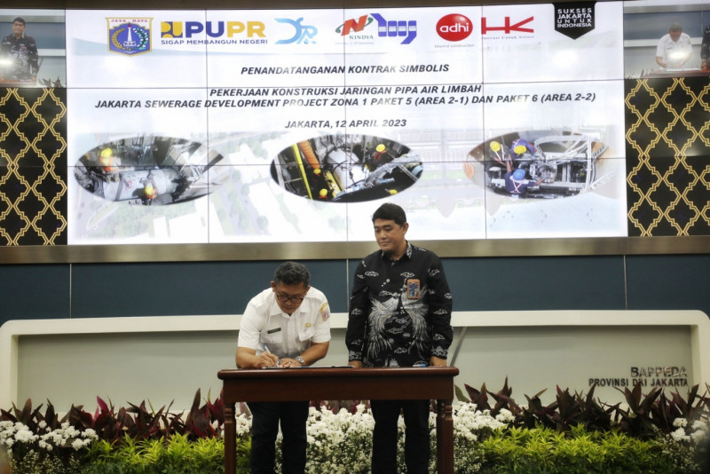 Penjabat (Pj) Gubernur DKI Jakarta, Heru Budi Hartono menyaksikan sekaligus memberikan arahan pada acara Penandatanganan Kontrak Pekerjaan Jaringan Pipa Air Limbah atau JSDP Zona 1 Paket 5 (Area 2-1) dan Paket 6 (Area 2-2) di Ruang Pola Balai Kota DKI Jakarta, Rabu (12/4). Dalam sambutannya Pj Gubernur mendukung percepatan pembangunan jaringan pipa air limbah Jakarta Sewerage Development Project (JSDP) zona 1 paket 5 (Area 2-1) dan paket 6 (Area 2-2). JSDP merupakan pembangunan jaringan perpipaan sistem pengelolaan limbah domestik terpusat dan terintegrasi skala perkotaan di Provinsi DKI Jakarta.