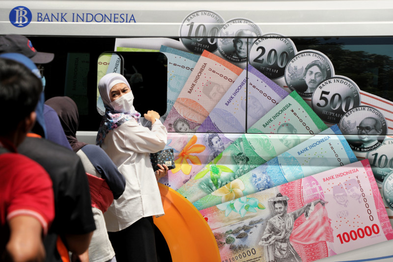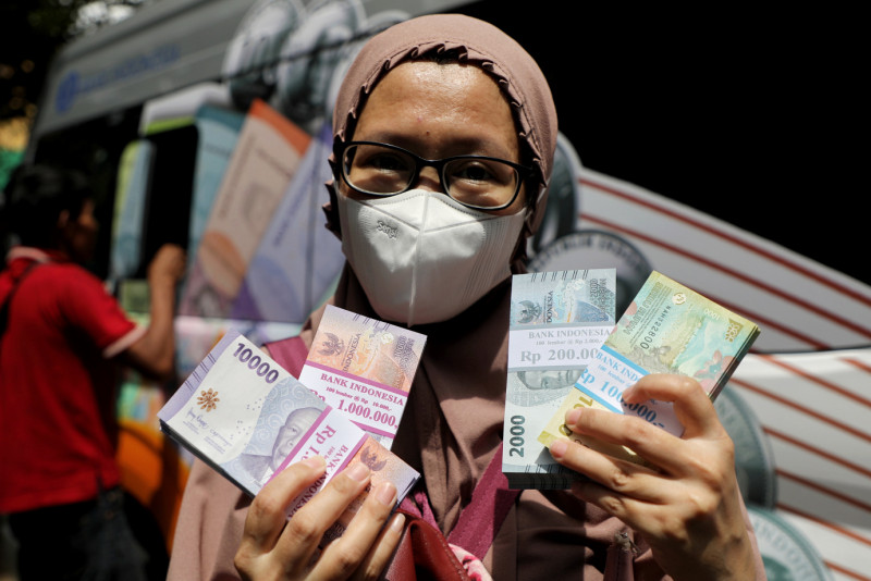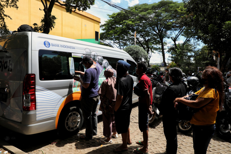 Menjelang akhir #Ramadan ratusan warga mengantre untuk menukarkan pecahan uang baru di mobil kas keliling Bank Indonesia (BI) di Pasar Induk Kramat Jati, Jakarta Timur, Kamis (13/4). Penukaran uang ini dilakukan untuk keperluan Lebaran Idulfitri 1444 H, Bank Indonesia bekerjasama dengan 16 bank wilayah DKI Jakarta, melakukan pelayanan penukaran uang di sejumlah wilayah di Jakarta.