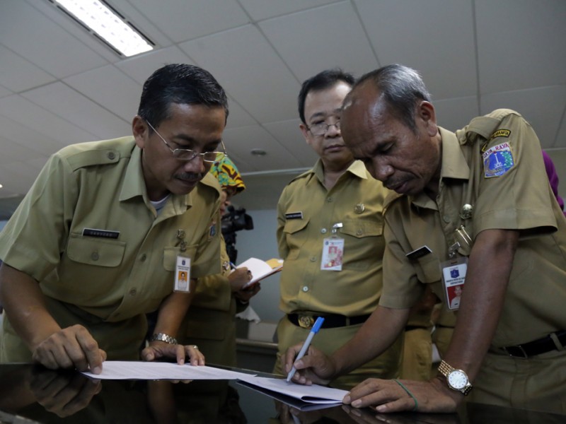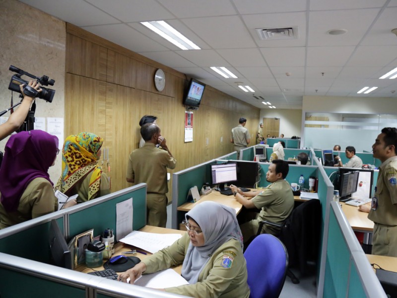 Jelang cuti bersama, Kepala Inspektorat Provinsi DKI Jakarta, Lasro Marbun bersama jajaran Badan Kepegawaian Daerah (BKD) melakukan inspeksi mendadak (Sidak) unutk mengecek kehadiran Pegawai Negeri Sipil (PNS) di Balaikota DKI Jakarta, Rabu (15/07/2015). Meski tingkat kehadiran sudah cukup baik, dalam Sidak tersebut didapati sejumlah PNS yang pulang lebih cepat atau mendahului berakhirnya jam kerja. (Foto : Reza/Beritajakarta.com)