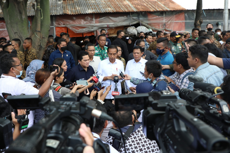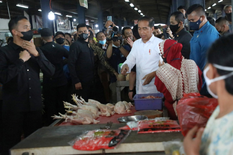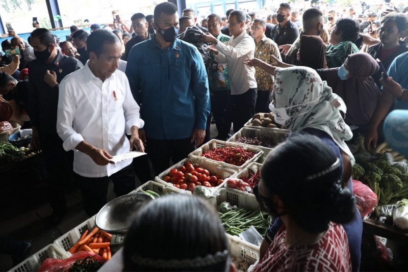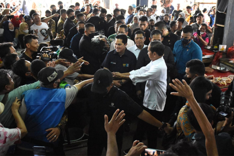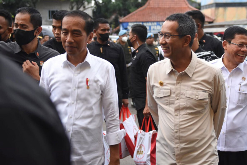 Penjabat (Pj) Gubernur DKI Jakarta, Heru Budi Hartono mendampingi Presiden RI, Joko Widodo meninjau kestabilan harga pangan menjelang Idulfitri di Pasar Minggu, Jakarta Selatan, Kamis (13/4). Turut mendampingi Menteri Badan Usaha Milik Negara (BUMN), Erick Thohir dan Wali Kota Jakarta Selatan, Munjirin. Presiden Joko Widodo juga memastikan bahwa ketersediaan kebutuhan pokok masih terkendali mulai dari bawang, telur hingga daging ayam.