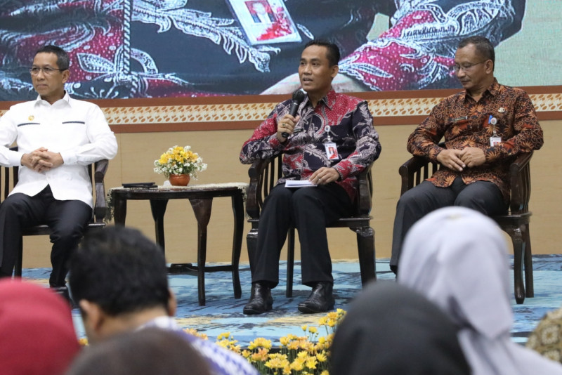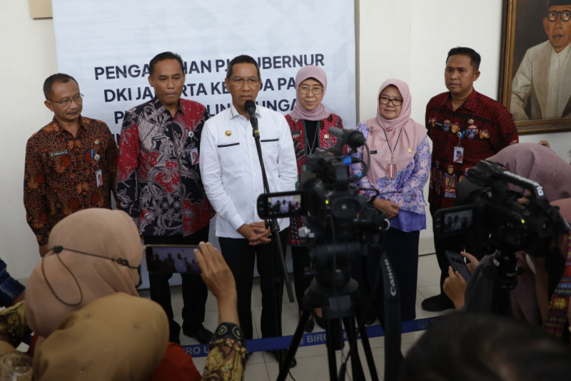 Penjabat (Pj) Gubernur DKI Jakarta, Heru Budi Hartono memberikan arahan kepada jajaran Dinas Pendidikan DKI Jakarta di Auditorium Ki Hajar Dewantoro, Gedung Dinas Pendidikan, Jalan Gatot Subroto, Kecamatan Setiabudi, Jakarta Selatan, Kamis (13/4). Dalam arahannya, Pj Gubernur Heru menekankan, kualitas pendidikan di Jakarta harus tetap terjaga dan tindakan perundungan tidak terjadi terhadap peserta didik.