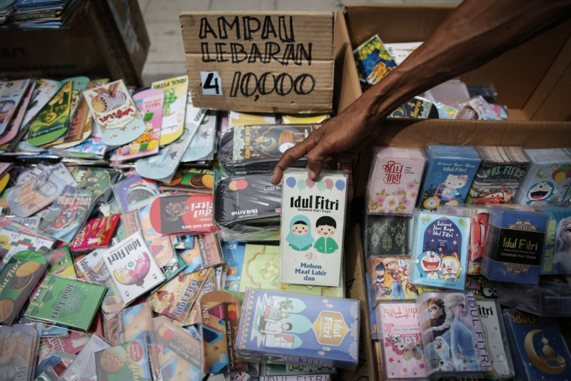 Menjelang akhir #Ramadan sejumlah pedagang menjual ornamen atau pernak-pernik bernuansa lebaran Idulfitri 1444 H di Pasar Pagi Asemka di Jalan Asemka, Kecamatan Tambora, Jakarta Barat, Jumat (14/4). Ornamen-ornamen yang ditawarkan seperti ucapan selamat Idulfitri, ornamen ketupat, amplop lebaran dll.