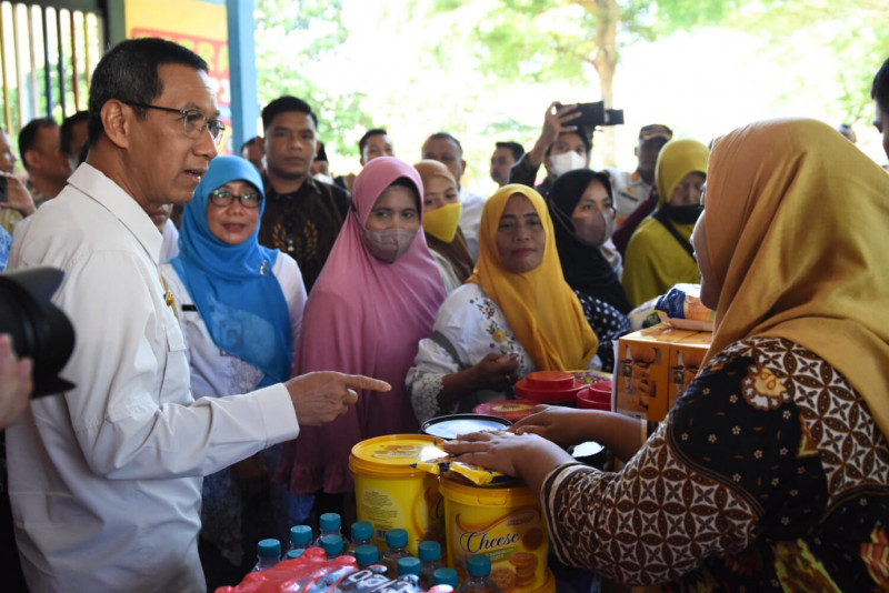 Penjabat (Pj) Gubernur DKI Jakarta, Heru Budi Hartono kunjungi kegiatan Pangan Murah Keliling di Ruang Publik Terpadu Ramah Anak (RPTRA) Kecapi, Pasar Minggu, Jakarta Selatan, Jumat (14/4). Kegiatan ini merupakan hasil sinergi Dinas Ketahanan Pangan, Kelautan dan Perikanan (KPKP), Dinas Perindustrian, Perdagangan, Koperasi, dan UKM (PPKUKM), PD Pasar Jaya, serta pihak swasta PT. Sinar Mas yang menyediakan bahan pangan pokok dengan harga yang lebih terjangkau.