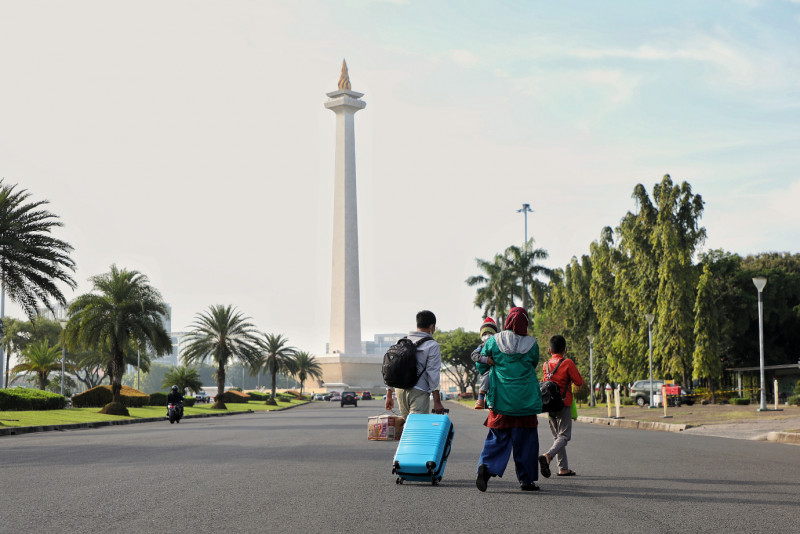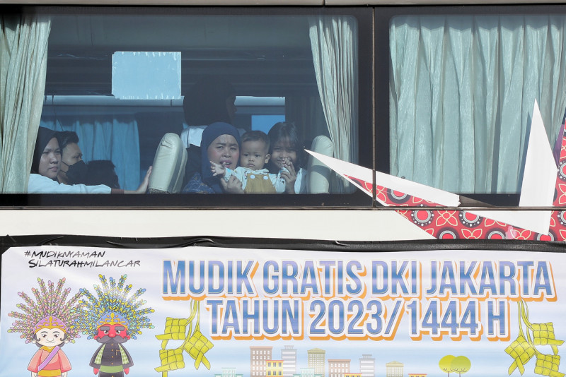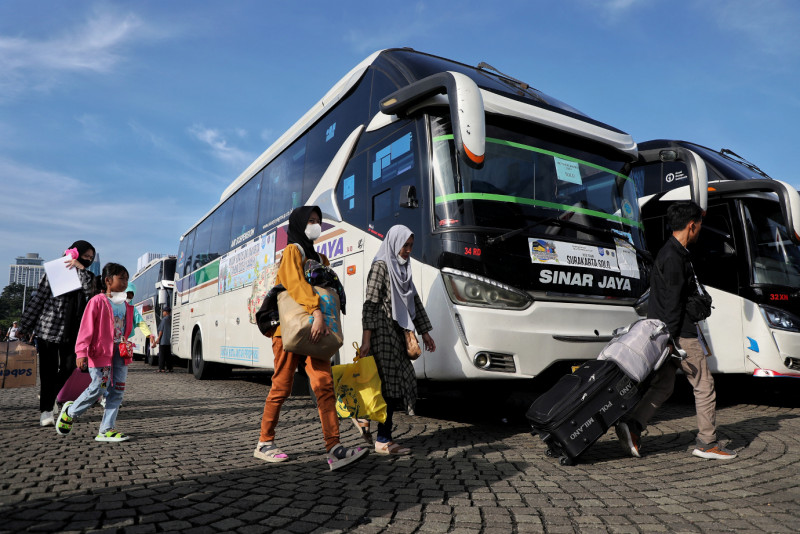 Penjabat (Pj) Gubernur DKI Jakarta, Heru Budi Hartono melepas secara kegiatan mudik gratis angkutan lebaran Pemerintah Provinsi DKI Jakarta di kawasan Monumen Nasional (Monas), Jakarta Pusat, Senin (17/4). Sebanyak 13.541 calon pemudik menuju 19 kota tujuan menggunakan 284 Bus diberangkatkan secara gratis oleh Pemprov DKI Jakarta melalui dinas perhubungan.