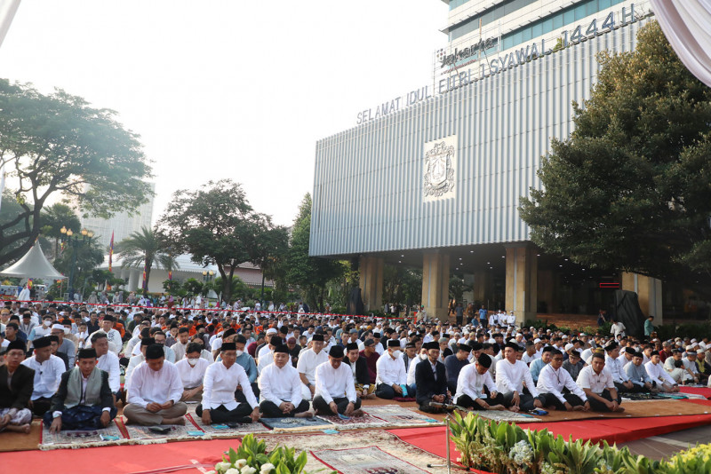 Penjabat (Pj) Gubernur DKI Jakarta, Heru Budi Hartono melaksanakan Salat #Idulfitri 1444 Hijriah bersama pejabat dan Aparatur Sipil Negara (ASN) serta warga di halaman Balai Kota DKI Jakarta, Sabtu (22/4). Momen ini mengingatkan Heru pada masa lalunya, ketika masih menjadi ASN di lingkungan Pemprov DKI Jakarta. Heru mengungkapkan, Salat Idulfitri 1444 H digelar di Balai Kota DKI Jakarta berdasarkan keinginan dari ASN sendiri, karena selain bisa membawa anggota keluarga dan mempermudah silaturahmi, lokasi tersebut juga mudah diakses.