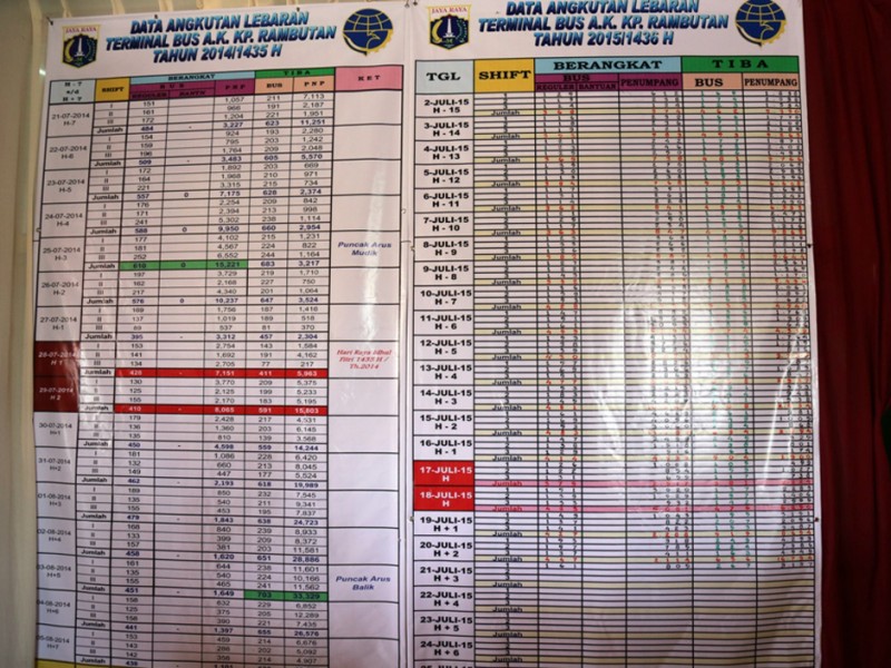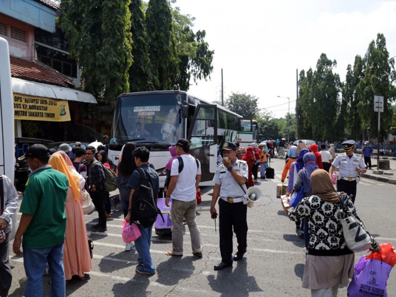 Ribuan penumpang bus tiba di Terminal bus Antar Kota Antar Propinsi (AKAP) Kampung Rambutan, Ciracas Jakarta Timur Selasa (21/7/2015). Ribuan penumpang ini tampak menuruni ratusan bus AKAP dari berbagai jurusan di Jawa Barat, Jawa Tengah dan Jawa Timur. Para penumpang tersebut ada yang menyempatkan diri untuk beristirahat sejenak di terminal kedatangan sebelum melanjukan perjalanan ke sejumlah wilayah di Ibu Kota, namun ada juga yang langsung menumpang kendaran umum yang telah tersedia di sekitar kawasan terminal. Selain itu di terminal keberangkatan masih terdapat calon penumpang yang hendak melakukan perjalanan dihari ketiga setelah lebaran dengan berbagai tujuan di Jawa Barat seperti Bandung, Garut dan Sukabumi. (Foto : Reza/Beritajakarta.com)