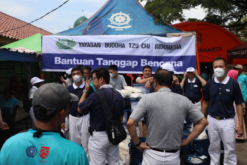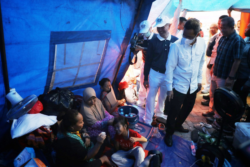 Penjabat (Pj) Gubernur DKI Jakarta, Heru Budi Hartono menghadiri penyerahan bantuan bagi penyintas kebakaran di Muara Angke, Pluit, Penjaringan, Selasa (25/4). Adapun bantuan berupa pakaian, selimut, air mineral dan beras ini merupakan hasil kerja sama dengan Yayasan Buddha Tzu Chi.