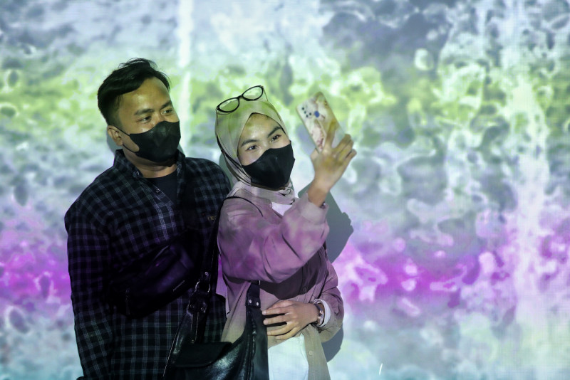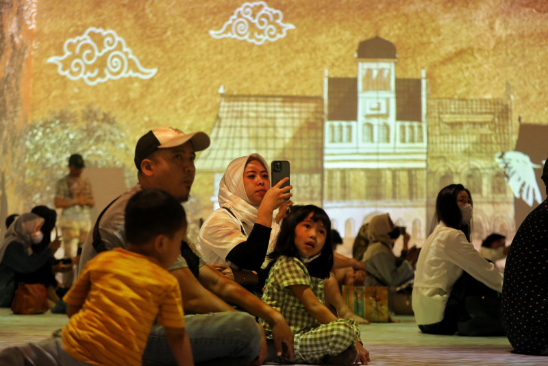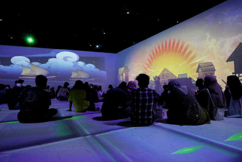 Sejumlah pengunjung menikmati instalasi pameran video mapping yang memanfaatkan teknologi imersif di Ruang ImersifA, Museum Nasional, Gambir, Jakarta Pusat, Senin (1/5). Sajian video mapping yang berdurasi 30 menit tersebut diproyeksi dengan sudut 360° termasuk lantai. Pengunjung yang menyaksikan akan merasakan sensasi seolah-olah ada di dalam video.