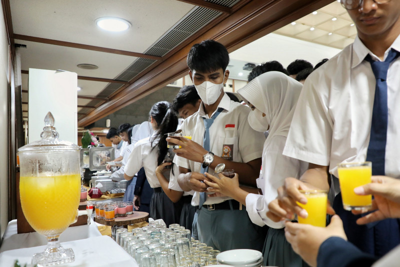 Pemerintah Provinsi (Pemprov) DKI Jakarta menjamu pelajar dan guru usai mengikuti upacara Hari Pendidikan Nasional di Balai Agung, Balai Kota Provinsi DKI Jakarta, Selasa (2/5). Jamuan makan tersebut sebagai bentuk apresiasi dan rasa syukur Pemprov DKI Jakarta memyambut hari Pendidikan Nasional. Para pelajar dan guru yang mengikuti jamuan makan di antaranya adalah pelajar berprestasi serta penyandang disabilitas.
