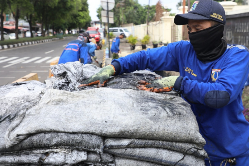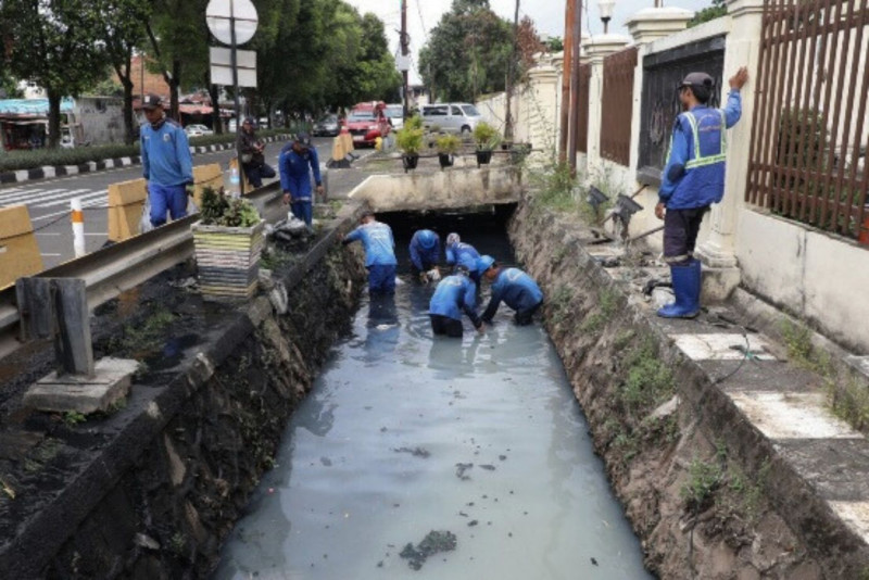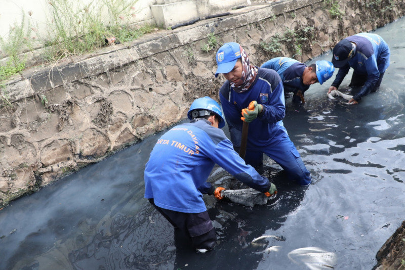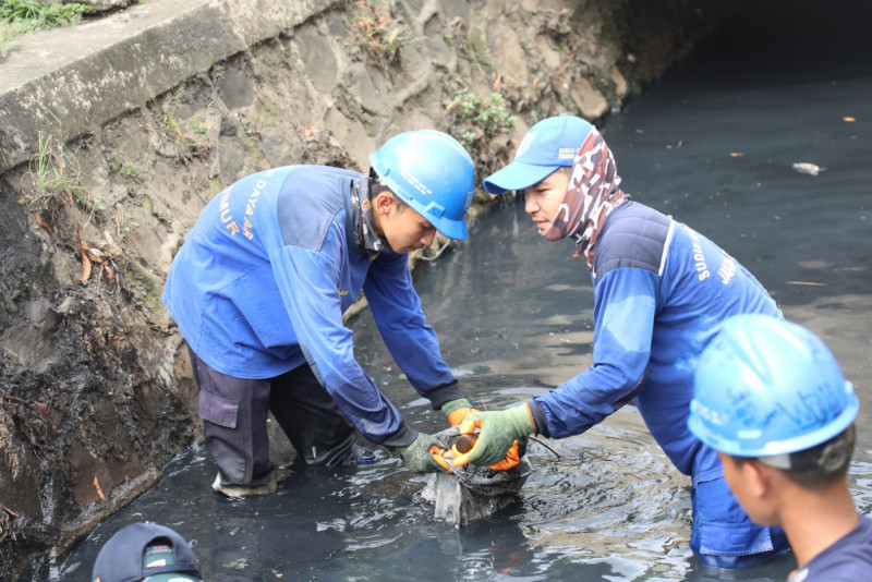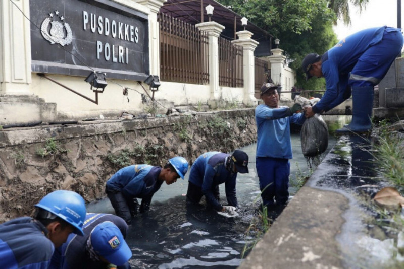 10 petugas Satuan Pelaksana Sumber Daya Air (Satpel SDA) Kecamatam Pulo Gadung melakukan pengurasan saluran penghubung (Phb) Sodong di Jalan Cipinang Baru Raya, Cipinang, Pulo Gadung, Jakarta Timur tepatnya di depan Pusdokkes Polri, Rabu (3/5). Pengurasan dikerjakan atas tindak lanjut dari Musrenbang Kecamatan 2023 dan pengerjaan ditargetkan selesai pada 17 Mei mendatang.