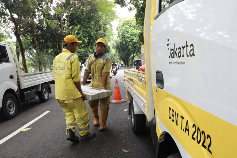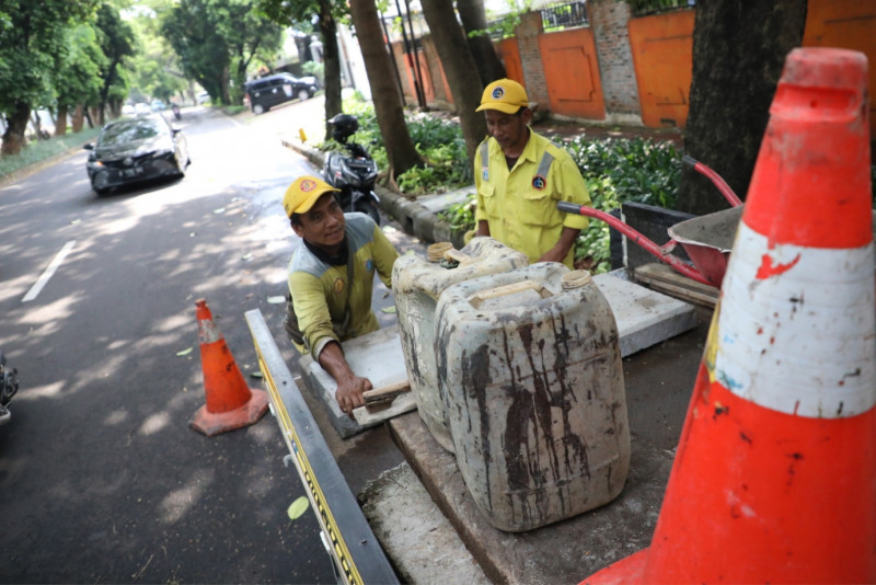 Lima petugas Satuan Pelaksana Bina Marga Kecamatan Menteng melakukan perbaikan tutup tali air di Jalan Latuharhary, Menteng, Jakarta Pusat, Kamis (4/5). Perbaikan turap tali air yang rusak dengan mengganti plat penutup tali air sehingga berfungsi optimal pada saat musim penghujan.