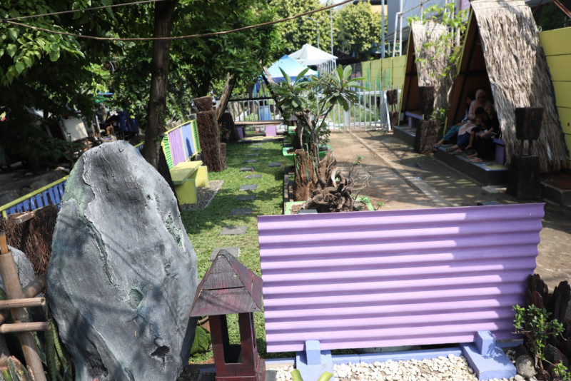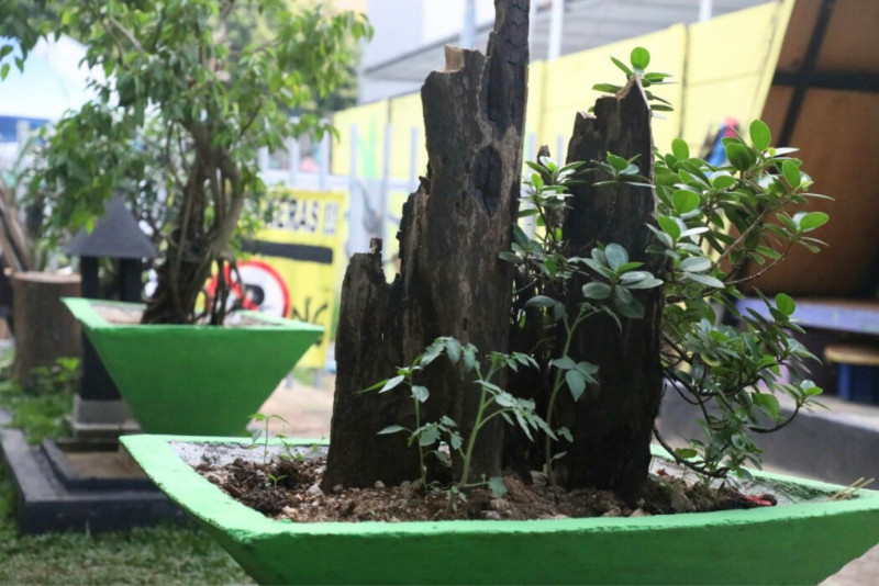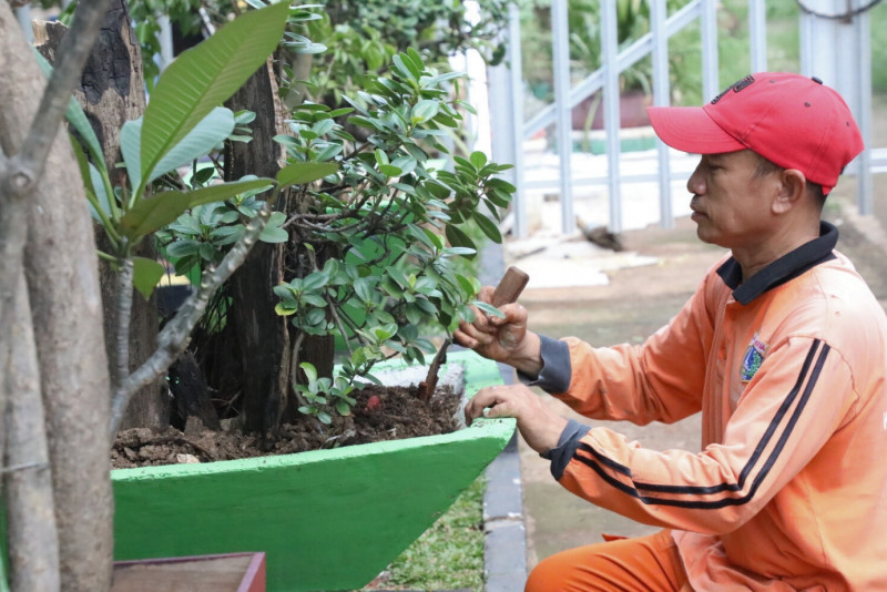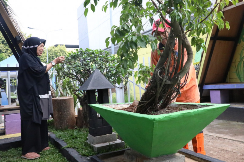 Sejumlah warga memanfaatkan taman kawasan unggulan 2 Kelurarahan Malaka Sari di Jalan Teratai Putih Raya, RT 10/04, Malaka Sari, Duren Sawit, Jakarta Timur, Jumat (5/5). Taman yang memiliki luas enam meter x 40 meter persegi ini dilengkapi dengan gazebo dan berbagai tanaman hias bonsai mulai dari bonsai beringin Korea, bonsai beringin lokal dan bonsai beringin legend.