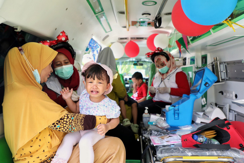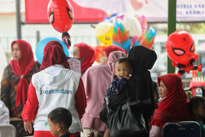 Pemerintah Kota Administrasi Jakarta Timur menggelar perayaan Pekan Imunisasi Dunia tingkat kota di RPTRA Mustika, Jalan Kerja Bakti, RT.02/10, Kelurahan Kramat Jati, Kecamatan Kramat Jati, Jakarta Timur, Selasa (9/5). Perayaan yang diikuti lebih dari 200 balita tersebut berisi rangkaian kegiatan seperti talkshow, imunisasi, pemeriksaan kesehatan dan tumbuh kembang balita.