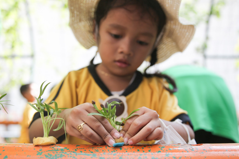 Sebanyak 35 murid Bina Keluarga Balita Pendidikan Anak Usia Dini (BKB PAUD) Intan diajarkan menanam sayuran dengan media hidroponik di Balkot Farm, Balai Kota DKI Jakarta, Rabu (10/5). Kegiatan tersebut bertujuan untuk memperkenalkan cara menanam bertani dengan metode hidroponik kepada anak-anak sejak usia dini.