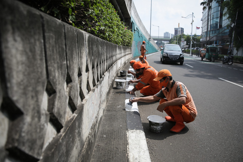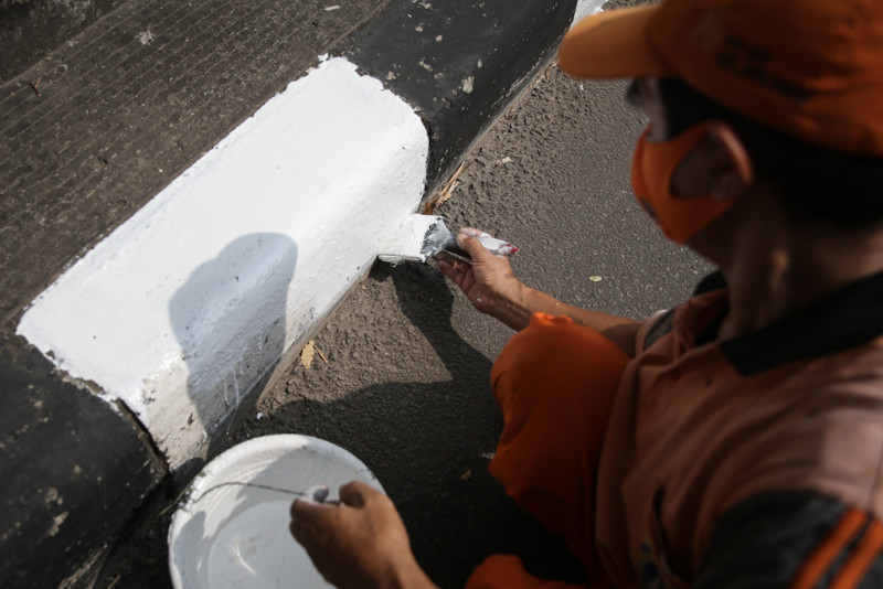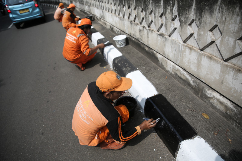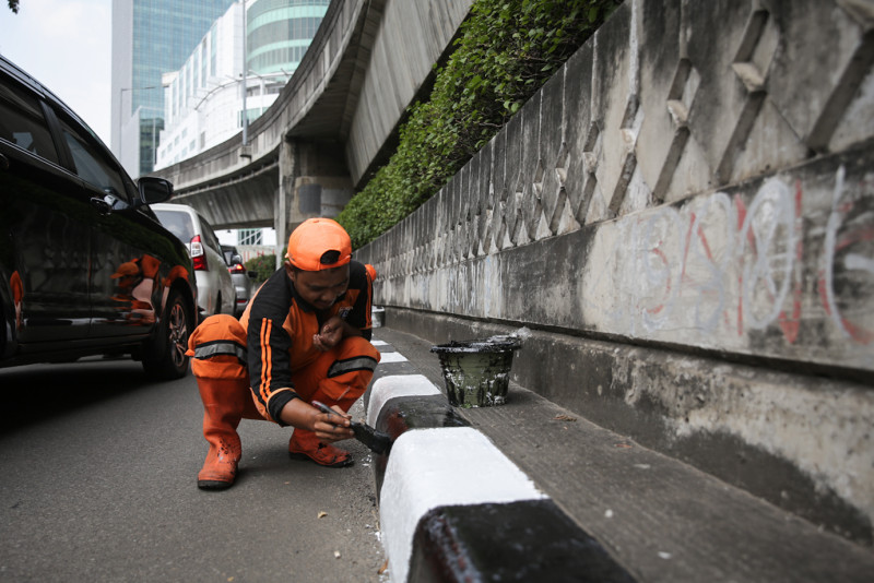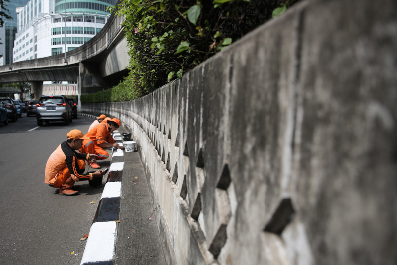Petugas Penanganan Prasarana dan Sarana Umum (PPSU) Kelurahan Melawai mengecat ulang kanstin Jalan Trunojoyo, Kecamatan Kebayoran Baru, Jakarta Selatan, Rabu (10/5). Kawasan sekitar Kantor Sekretariat ASEAN terus dipercantik dan dibersihkan menjelang penyelenggaraan KTT ASEAN 2023 yang akan berlangsung di Jakarta pada bulan September.
