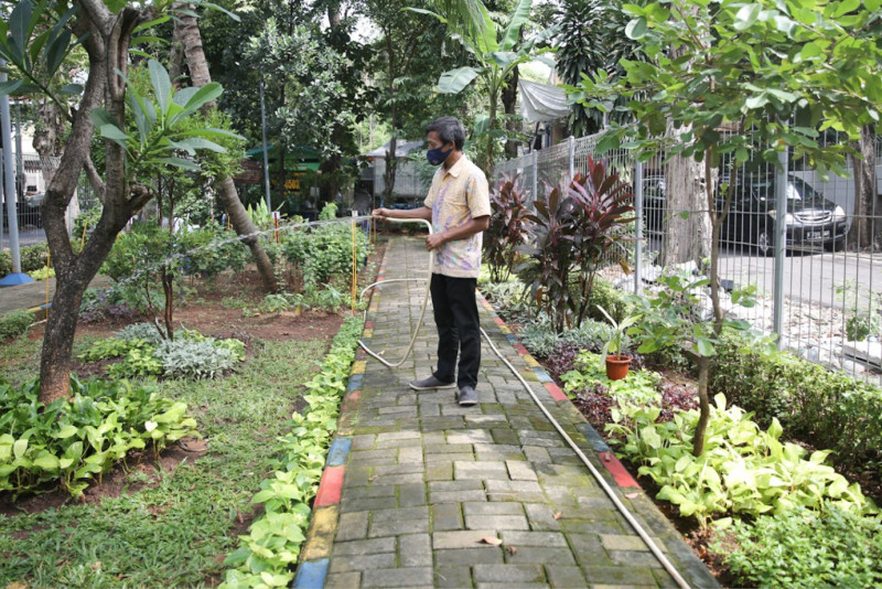 Petugas melakukan perawatan Ruang Publik Terpadu Ramah Anak (RPTRA) Taman Apel di Jalan Tanjung Duren Utara 3, Kecamatan Grogol Petamburan, Jakarta Barat, Kamis (11/5). RPTRA yang diresmikan pada tanggal 10 Oktober 2017 tersebut terus dirawat secara rutin oleh petugas sehingga masih tampak asri dan berfungsi maksimal hingga saat ini.