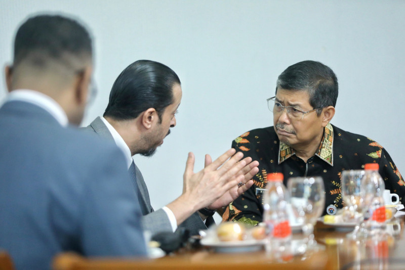 Deputi Gubernur Bidang Budaya dan Pariwisata DKI Jakarta, Marullah Matali menerima kunjungan Duta Besar Libya untuk Indonesia, Zakarya Muhammad El Maghrabi di Ruang Rapat Deputi, Balai Kota, DKI Jakarta, Kamis (11/5). Dalam kunjungannya Dubes Libya untuk Indonesia menyampaikan sejumlah harapan diantaranya, nama kota Tripoli ada di Jakarta. Sebab, nama Jakarta, Bandung dan Presiden RI pertama, Soekarno dijadikan nama jalan protokol di Libya. Selain itu, Dubes Libya untuk Indonesia juga akan mengundang Pemprov DKI Jakarta untuk kerja sama dengan pemerintah kota Tripoli dalam beberapa bidang seperti pendidikan, penataan kota dll.