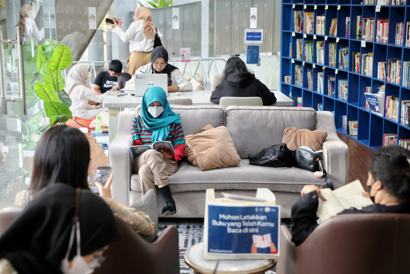 Sejumlah warga membaca buku koleksi perpustakaan Taman Literasi Martha Christina Tiahahu di Blok M, Jakarta, Senin (15/5). Perpustakaan baca yang menyediakan sekitar 3.000 koleksi buku tersebut merupakan ruang literasi yang dibuat guna meningkatkan minat baca bagi warga Jakarta.