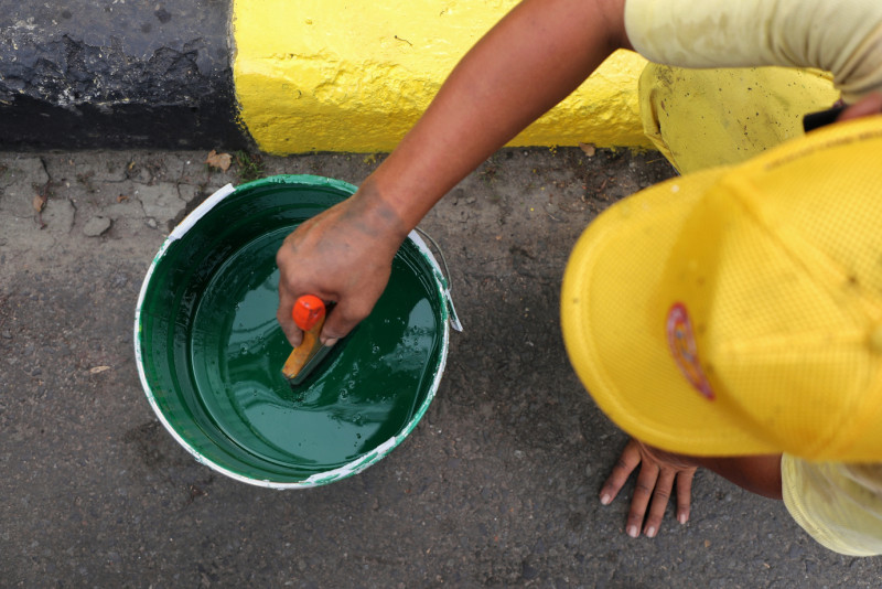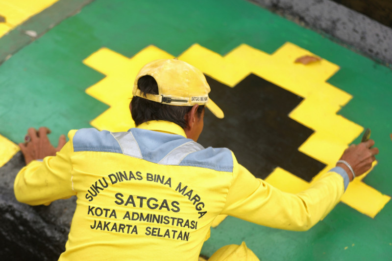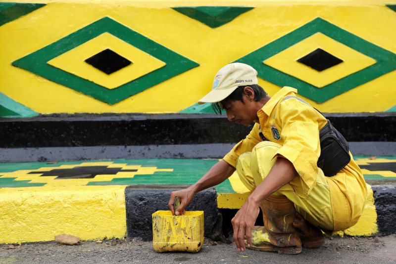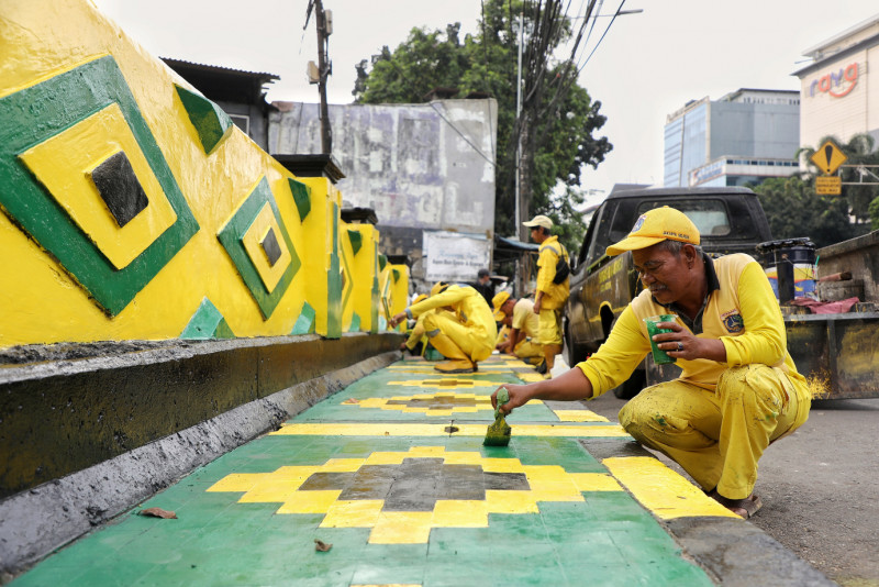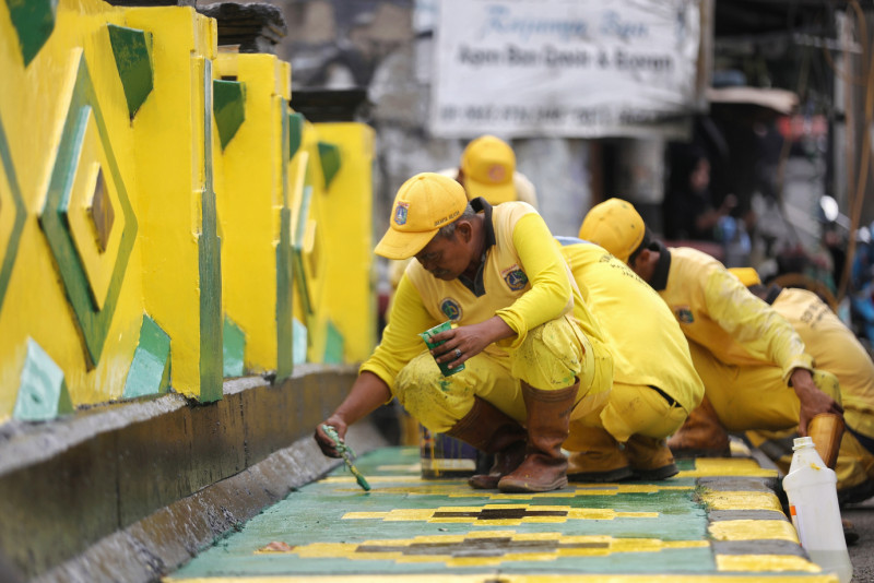 Satuan Pelaksana (Satpel) Bina Marga Kecamatan Pancoran mempercantik jembatan di Jalan Hajjah Tutty Alawiyah, Kelurahan Kalibata, Jakarta Selatan, Rabu (17/5). Jembatan yang dipercantik dengan dilakukan pengecatan warna kuning hijau dan hitam tersebut ditargetkan rampung pada 18 Mei 2023.