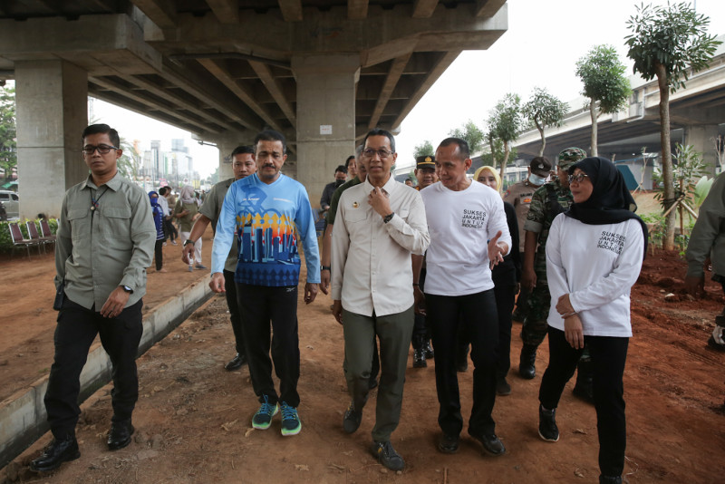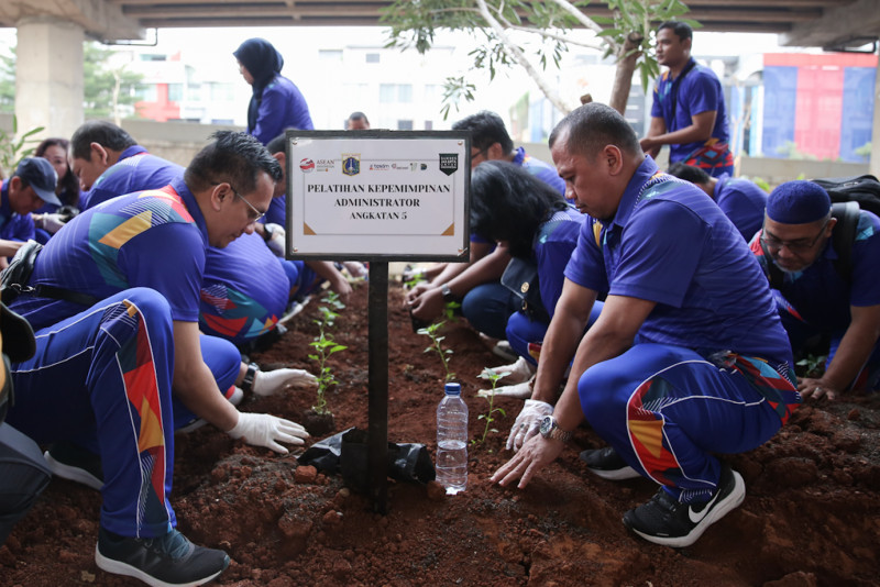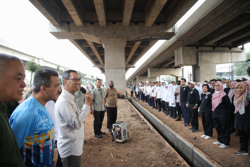 Penjabat (Pj) Gubernur DKI Jakarta, Heru Budi Hartono memimpin gerakan menanam bersama di area kolong Tol Becakayu, Jalan Laksamana Malahayati, Duren Sawit, Jakarta Timur, Jumat (19/6). Sebanyak 100 orang peserta Pelatihan Kepemimpinan Administrator (PKA) dan Pengawas (PKP) serta pegawai BPSDM Provinsi DKI Jakarta mengikuti kegiatan penanaman pohon bersama Pj Gubernur.
