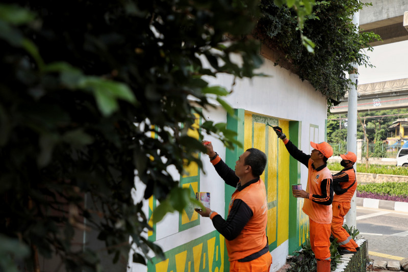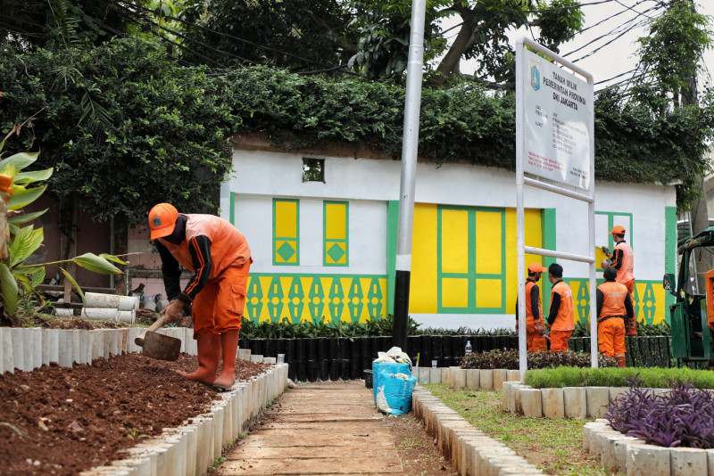 Petugas Penanganan Prasarana dan Sarana Umum (PPSU) Lenteng Agung melakukan penataan kawasan di Jalan Lenteng Agung Raya, Kelurahan Lenteng Agung, Kecamatan Jagakarsa, Jakarta Selatan, Jumat (19/5). Penataan kawasan tersebut dilakukan di lahan tidak terpakai milik Dinas Bina Marga DKI Jakarta sisa pembangunan Flyover Tapal Kuda Lenteng Agung dengan pembuatan taman serta spot selfie dengan tema rumah Betawi.