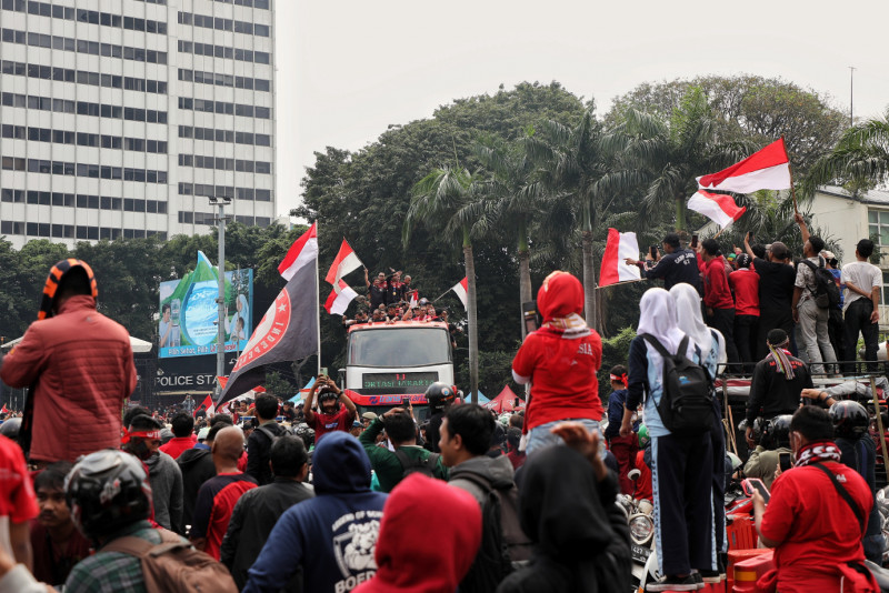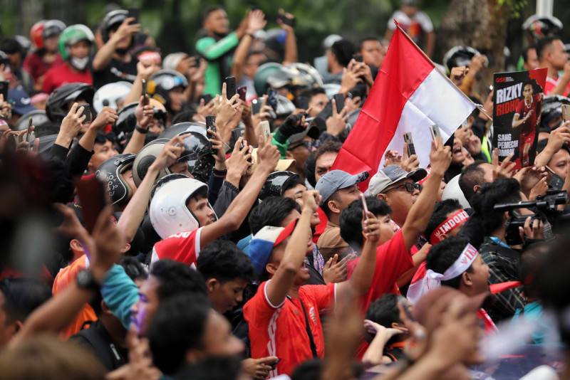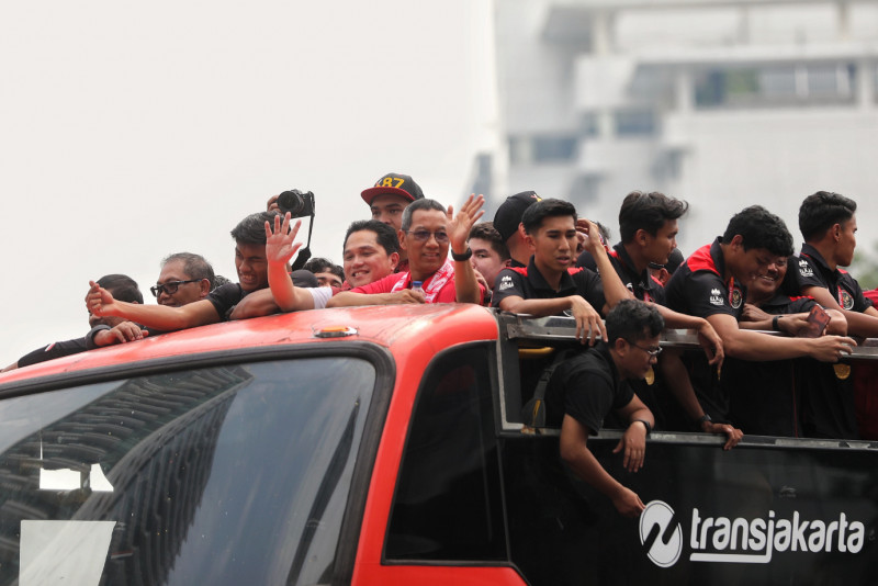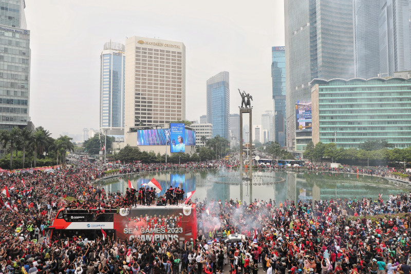 Ratusan kontingen atlet Indonesia Tim Nasional yang berlaga di ajang Sea Games 2023 mengikuti pawai kirab juara mulai dari Gedung Kemenpora RI, kawasan Bundaran Hotel Indonesia dan berakhir di Gelora Bung Karno (GBK), Jumat (19/5). Pawai kirab juara tersebut dilakukan usai para atlet berhasil membawa 87 medali emas, 80 perak, dan 109 perunggu pada perhelatan SEA Games 2023 di Kamboja.
