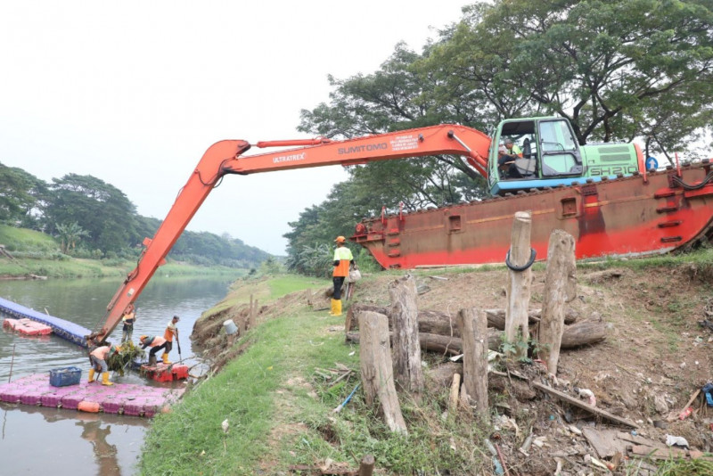 Petugas Unit Penanganan Sampah Badan Air (UPSBA) Dinas Lingkungan Hidup (LH) membersihkan sampah di sepanjang aliran Kanal Banjir Timur (KBT), Pondok Kopi, Duren Sawit, Jakarta Timur, Jumat (19/5). Setiap harinya tiga hingga lima kubik sampah berhasil diangkut petugas UPSBA.