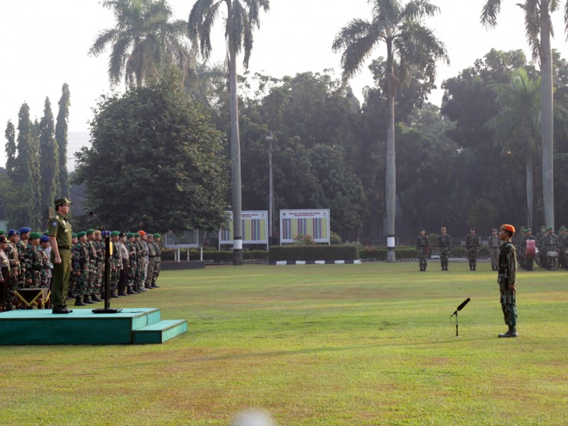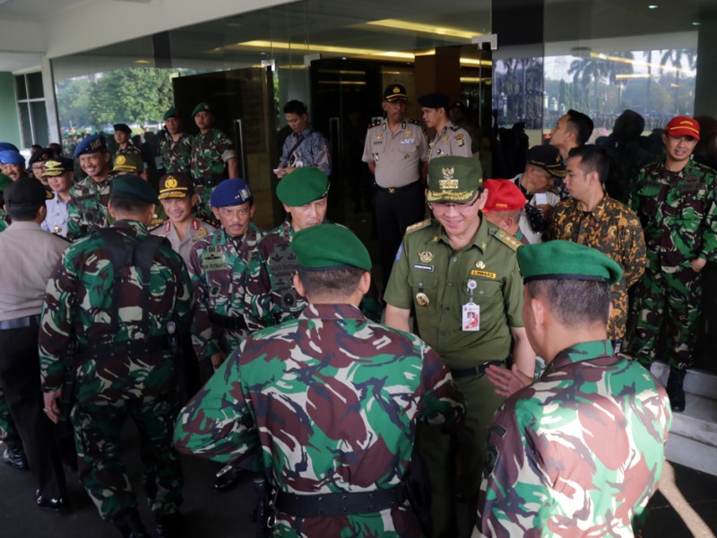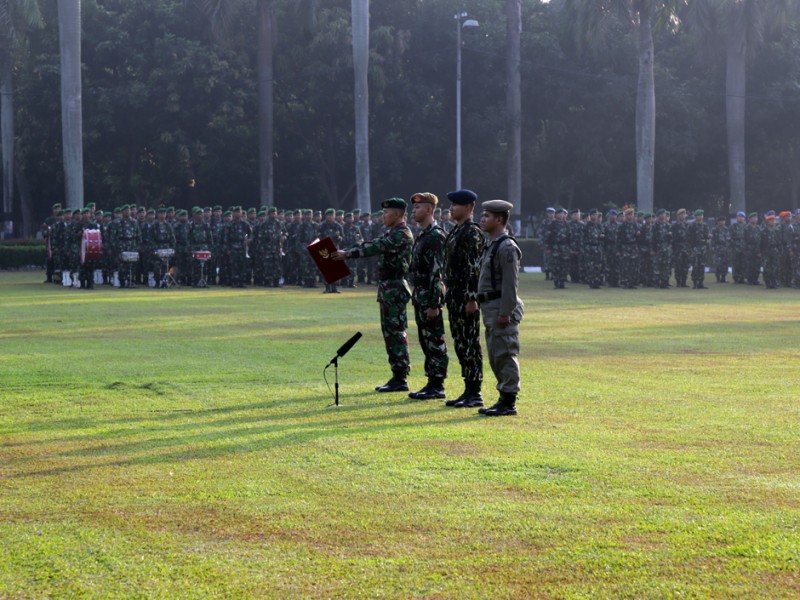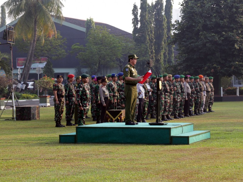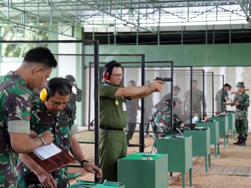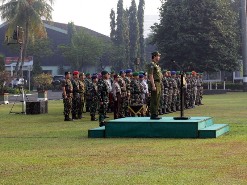 Gubernur DKI Jakarta, Basuki Tjahaja Purnama bertindak sebagai IRUP pada Upacara bersama Prajurit TNI, POLRI dan Aparat Pemprov DKI Jakarta di Makodam Jaya, Senin (27/07/2015). Dalam kesempatan tersebut Basuki juga melakukan Halal Bihalal bersama anggota Forum Koordinasi Pimpinan Daerah (Forkopimda) dan latihan menembak. (Foto : Reza/Beritajakarta.com)