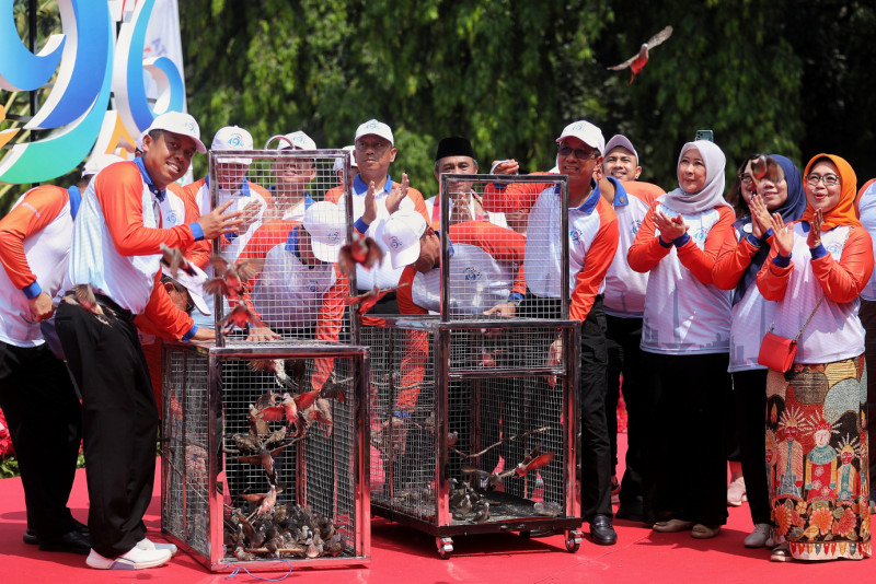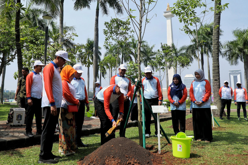 Pemprov DKI Jakarta menggelar pencanangan HUT ke-496 Kota Jakarta di Silang Utara Monas, Gambir, Jakarta Pusat, Minggu (21/5). Pencanangan HUT ke-496 Kota Jakarta dilaksanakan secara simbolis dengan penanaman pohon cempaka dan pelepasan 496 burung bekerja sama dengan Balai Konservasi Sumber Daya Alam DKI Jakarta Kementerian Kehutanan RI dan sejumlah lembaga/komunitas di bidang lingkungan hidup.