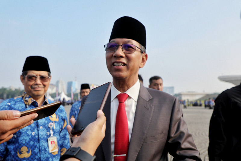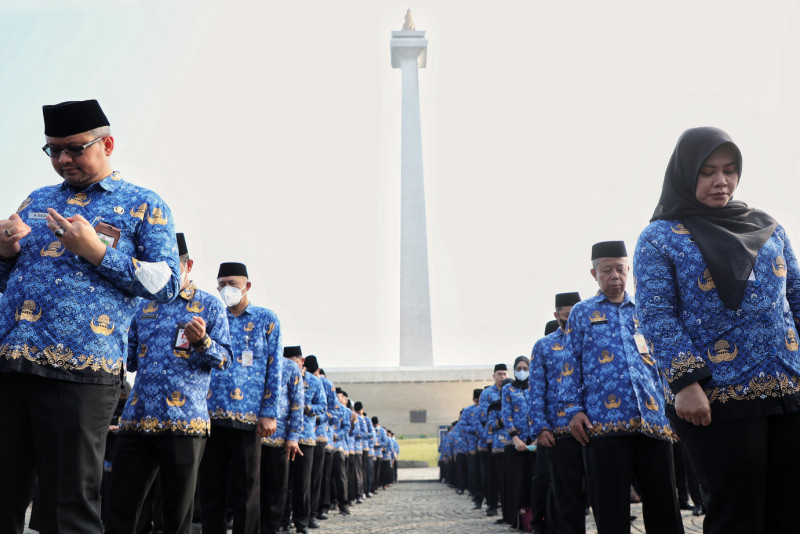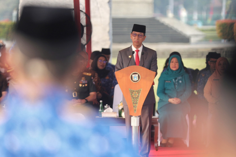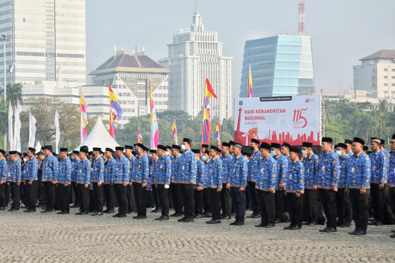Penjabat (Pj) Gubernur DKI Jakarta, Heru Budi Hartono bertindak sebagai Inspektur Upacara (Irup) dalam Peringatan Hari Kebangkitan Nasional ke-115 di Sisi Selatan Monumen Nasional (Monas), Gambir, Jakarta Pusat, Senin (22/5). Upacara tersebut diikuti oleh seluruh Aparatur Sipil Negara (ASN) di lingkungan Pemerintah Provinsi (Pemprov) DKI Jakarta.