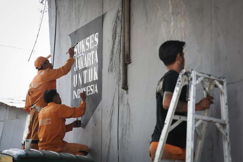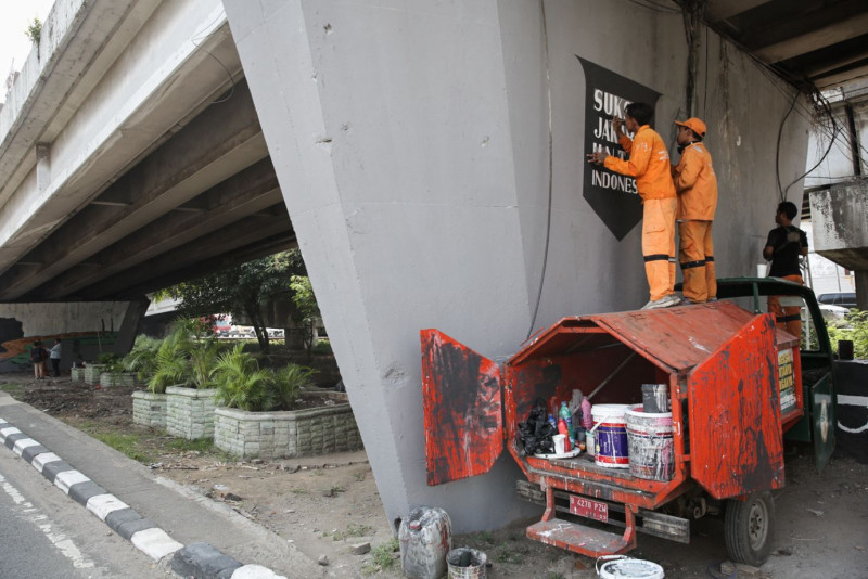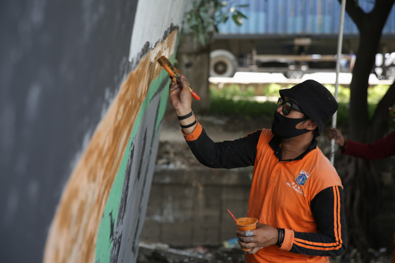 Sembilan petugas Penanganan Prasarana dan Sarana Umum (PPSU) Kelurahan Pejagalan melukis mural di tiang fly over Pejagalan di Jalan Jembatan Dua, Penjaringan, Jakarta Utara, Selasa (23/5). Pelukisan mural ini merupakan bagian dari program penataan kawasan unggulan triwulan kedua yang gencar dilakukan di sejumlah wilayah Jakarta.