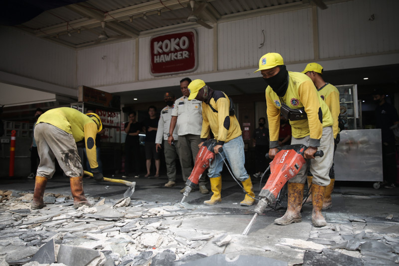 Pemerintah Provinsi DKI Jakarta bertindak tegas dengan melakukan pembongkaran bidang bangunan yang melanggar aturan di Ruko Niaga Pluit, Jalan Pluit Karang Niaga, Blok Z-4 Utara, Penjaringan, Jakarta Utara, Rabu (24/5). Petugas membongkar bidang bangunan ruko yang memakan bahu jalan dan menutup saluran air karena telah melewati tenggat waktu bongkar mandiri pada 19 - 23 Mei 2023.