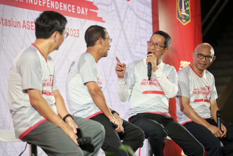 Penjabat (Pj) Gubernur DKI Jakarta, Heru Budi Hartono menghadiri kick off Jakarta Half Marathon di Stasiun MRT ASEAN, Kebayoran Baru, Jakarta Selatan, Kamis (25/5). Jakarta Half Marathon ini sebagai bagian dari perayaan HUT Kemerdekaan RI ke-78 dan HUT ke-56 ASEAN pada tanggal 20 Agustus mendatang.